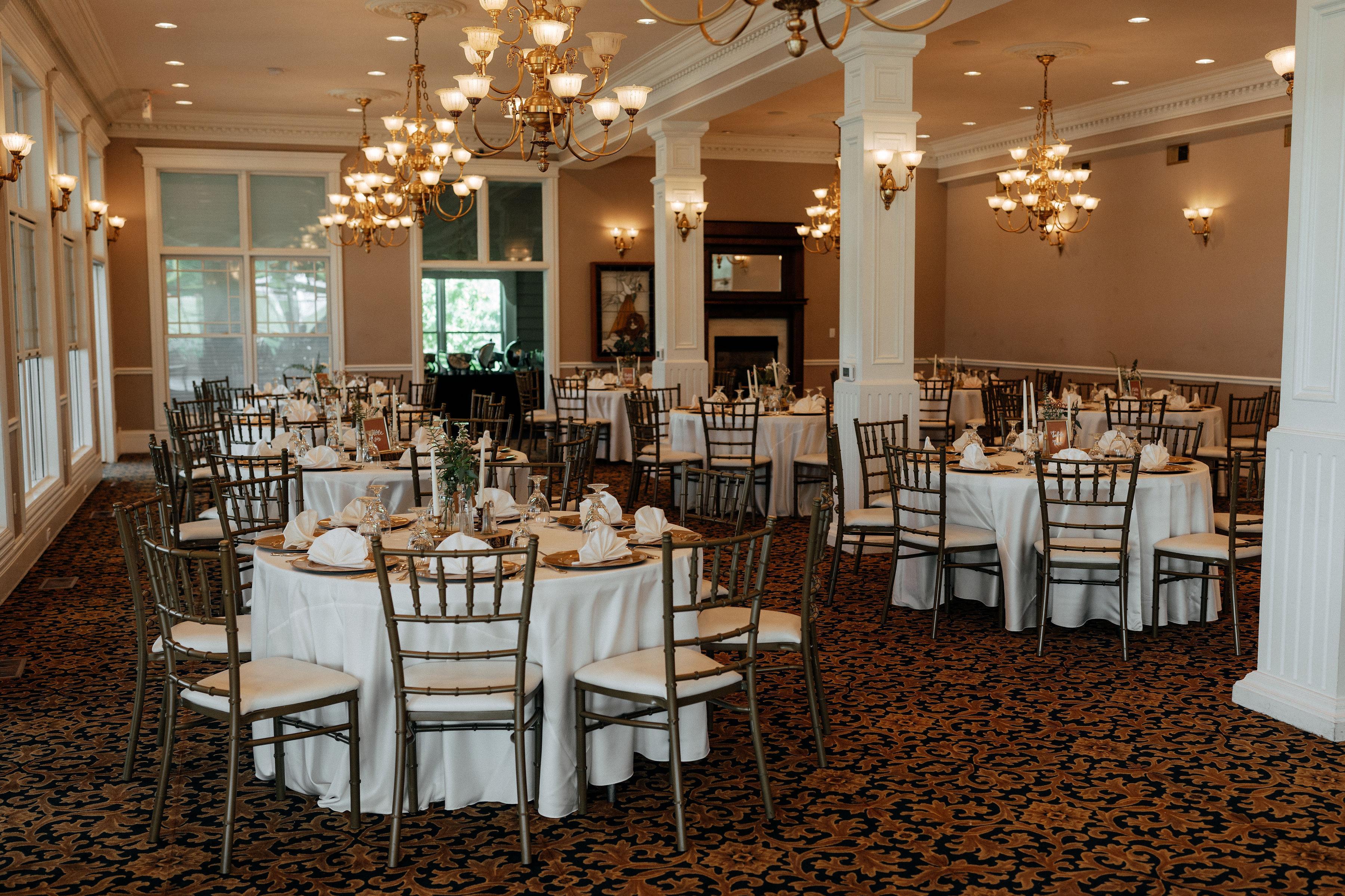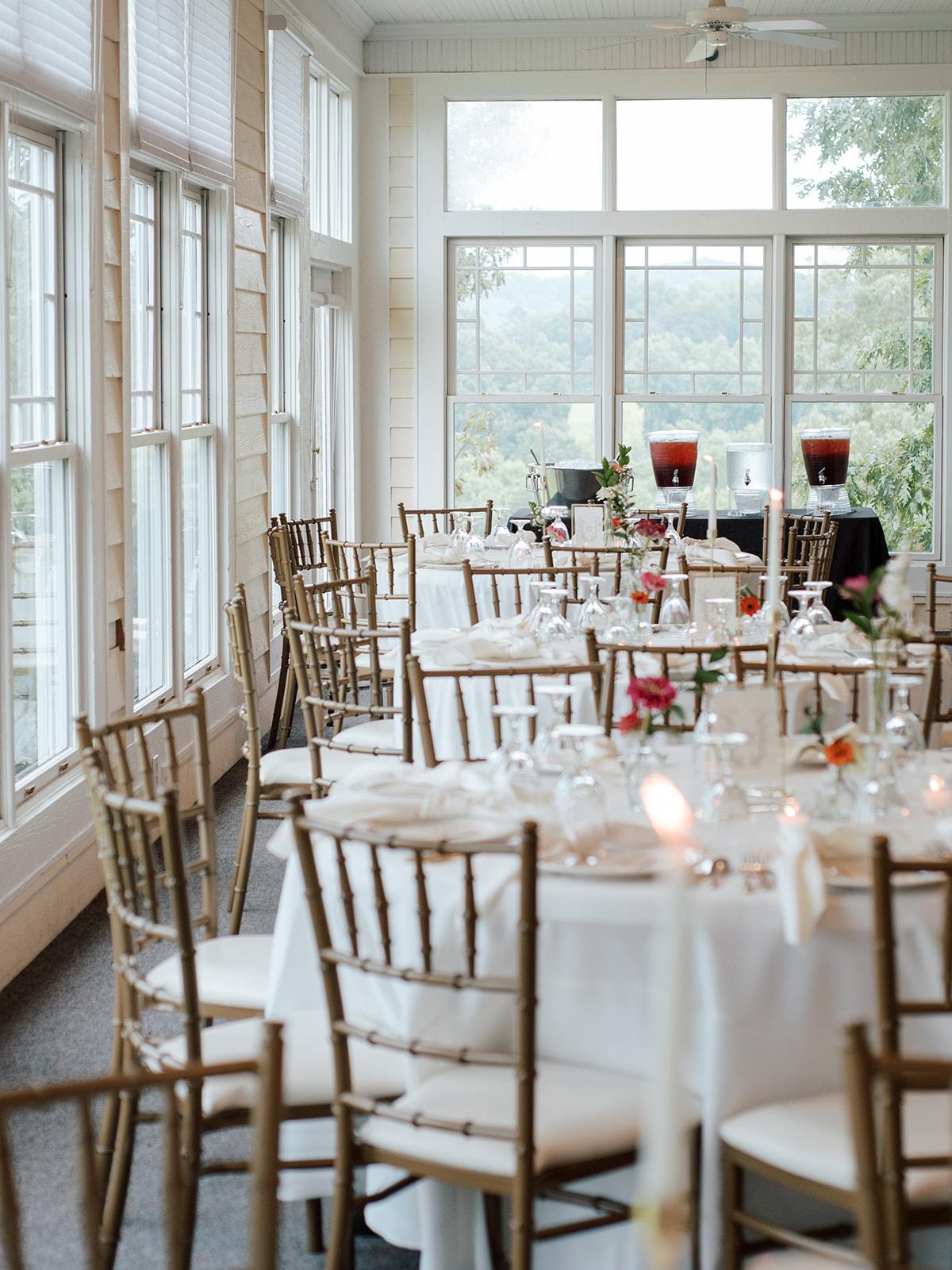 Just steps away from the ceremony site, our beautiful reception space overlooks the rolling hills & lake.