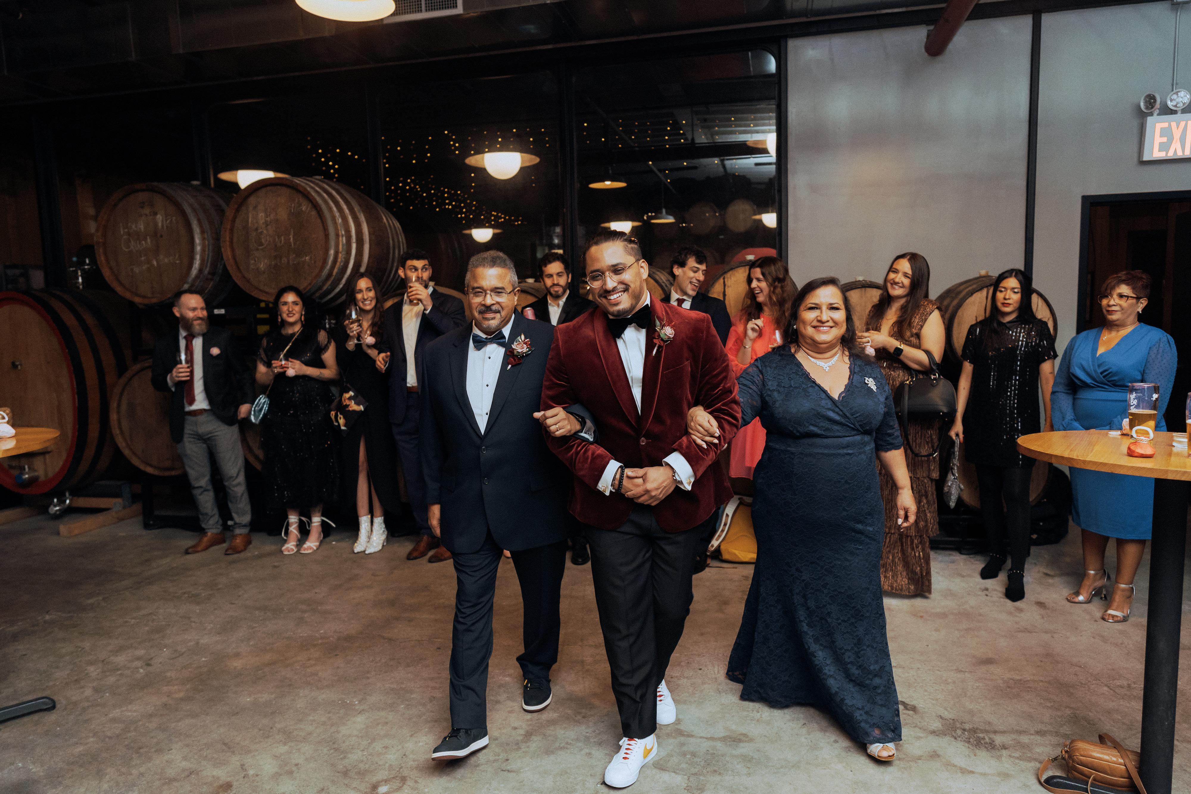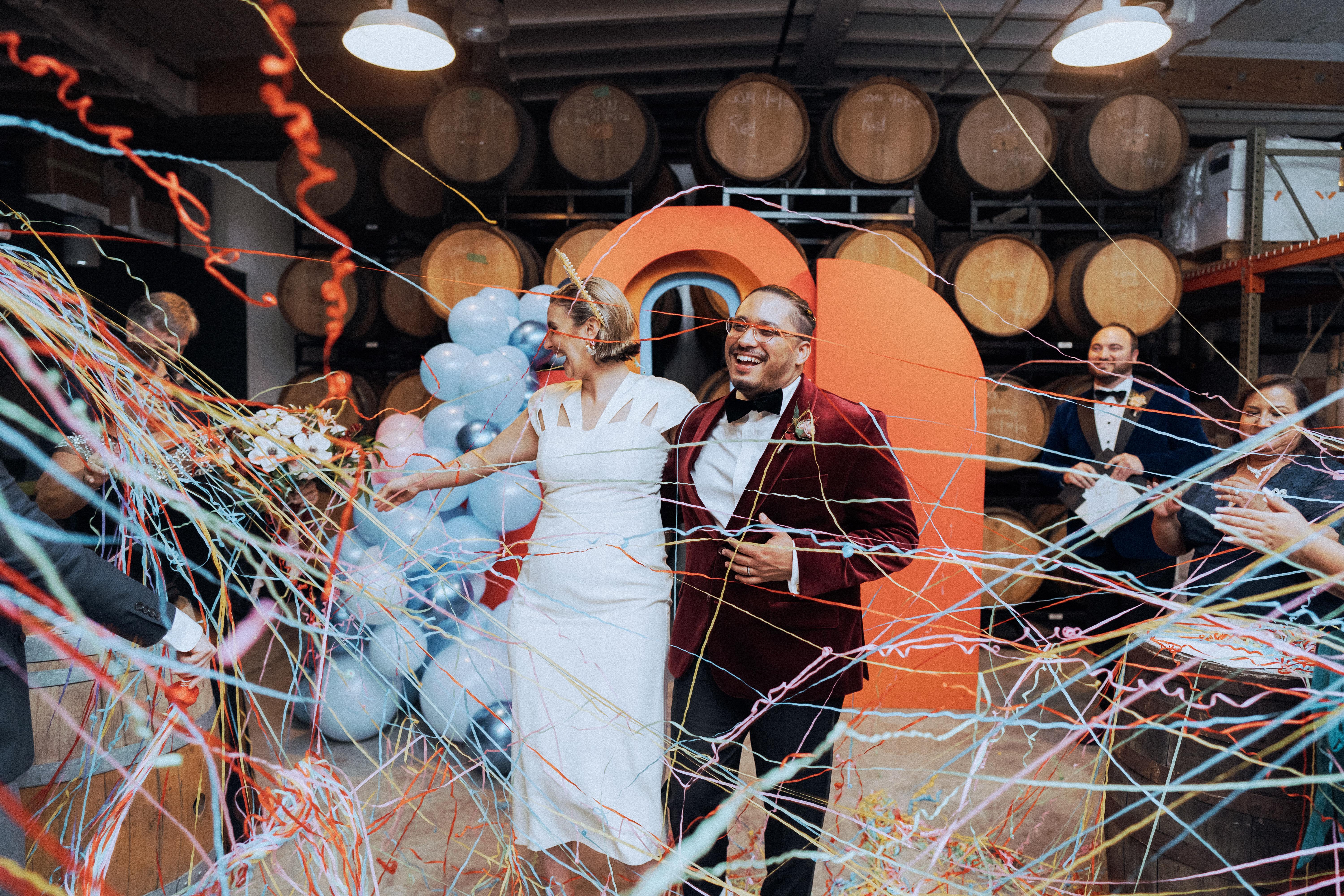 We threw a February wedding at Wild East on a Sunday, with a guest count of 120. We rented out the main Taproom and the Cellar for a 4pm start, kicking off with a 20-minute ceremony, then a floating dinner with two food stations, toasts, cake-cutting, and a dancefloor to keep things going. It was a lot to pull off, and Wild East Brewing was the perfect space to do it! Wild East has some of the best beers in Brooklyn, with consistent quality across styles, so there’s something for everyone. The space itself has the right balance of existing ambiance and opportunity to infuse your own aesthetic. One of my favorite parts of the evening was that we opened up the Cellar to be a low-stimulation room, a little quieter than the Taproom dancefloor, with rented furniture and a table for crafts. (This was meant for adults but it turns out the kids in attendance like crafts too – who knew?!) It also made for a perfect green room before and after the ceremony for the two of us to share a quiet moment alone as a couple. The events coordinator Casey and owner Tyler were very accommodating when it came to decorating in the space, allowing for our friends to take the reins hanging a backdrop for the ceremony and decorating the bar and tables with fresh flowers, foraged pieces, and candles. They were super supportive of storing things before and after the event, neutralizing a lot of the load-in/load-out headache. While communication was sometimes a little lax (they are a 7-day/wk taproom and active brewing space) everyone was truly lovely to work with and extremely supportive on the event day. The bartenders were super respectful and upbeat, working cheerfully all night long. Casey was kind, really chill, and open to ideas throughout the process; she even gave us a couple of four-packs when we came the next day to load our final boxes and cake out, which was a really sweet gesture. Casey really helped make our wedding day everything we wanted it to be, and we’re so grateful for all her coordination. Overall, the experience was exactly what we hoped for: the Wild East team let us run with our ideas, the staff were incredibly kind, and we were thrilled that our family and out of town friends had easy hotel accommodations and train options nearby. Plus, we were supervised throughout the night by their two working cats, Patience and Fortitude! Would highly recommend working with the good folks at Wild East. P.S. Hanging a disco ball and pin lights took the dance floor to the next level!