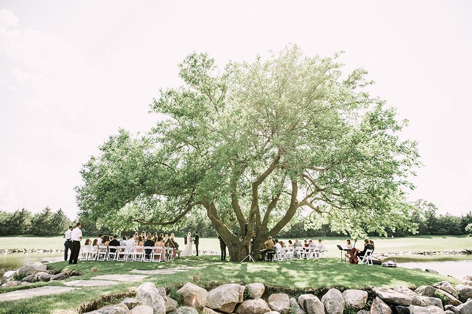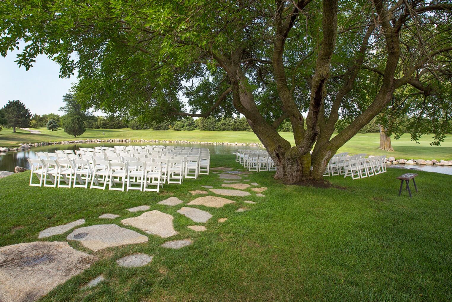 The Wedding Island at Wilderness Ridge is situated on the first hole of the Talon Course and provides picturesque views from every angle. After a walk down a stone path, your guests will be seated and waiting for you under a sprawling elm tree. Breathe in the beauty of nature as you say your vows overlooking one of our many beautiful ponds on the property.
