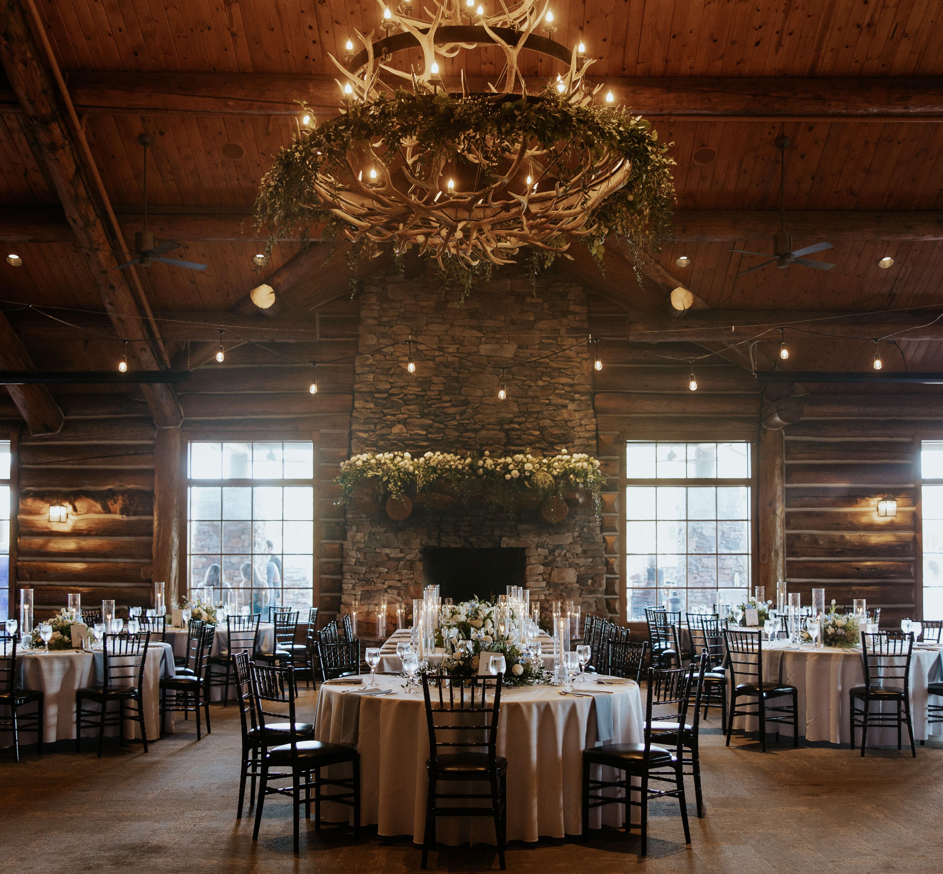 The Yellowstone Ballroom is situated on the first floor of the clubhouse and overlooks the Championship Course. The Yellowstone Ballroom, built of natural timber and equipped with 32-foot vaulted ceilings, a stone fireplace, two walls of windows, and a cedar deck, provides an exceptional experience second to none. You and your guests will enjoy the evening feeling as if you have been swept away into the mountains.