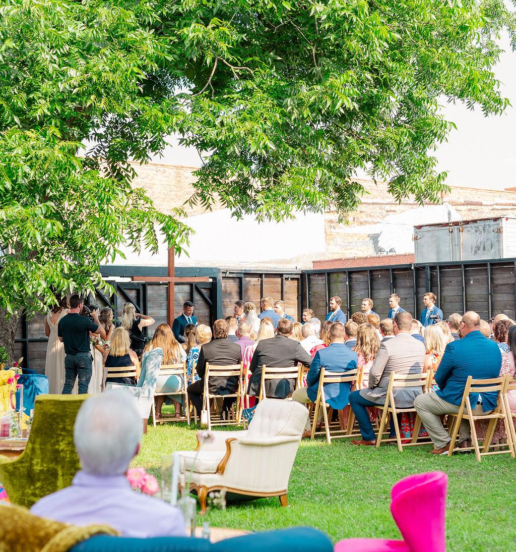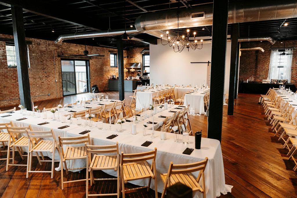 Wildoaths offers a fantastic mix of indoor and outdoor spaces to accommodate your celebration. The interior of the 6,000-square-foot building boasts 18ft ceilings, original exposed brick walls, sleek modern finishes, and industrial touches like exposed ductwork, providing a sophisticated backdrop for your reception. The main floor can accommodate up to 150 seated guests and includes a full kitchen and bathroom. Outside, you'll find a beautiful outdoor patio and courtyard (one of which features a stunning wooden fence and a large, stately tree), providing a picturesque and charming space for an outdoor ceremony or cocktail hour. For your convenience, the venue also includes a 2-bedroom, 2-bathroom apartment upstairs for overnight accommodations.