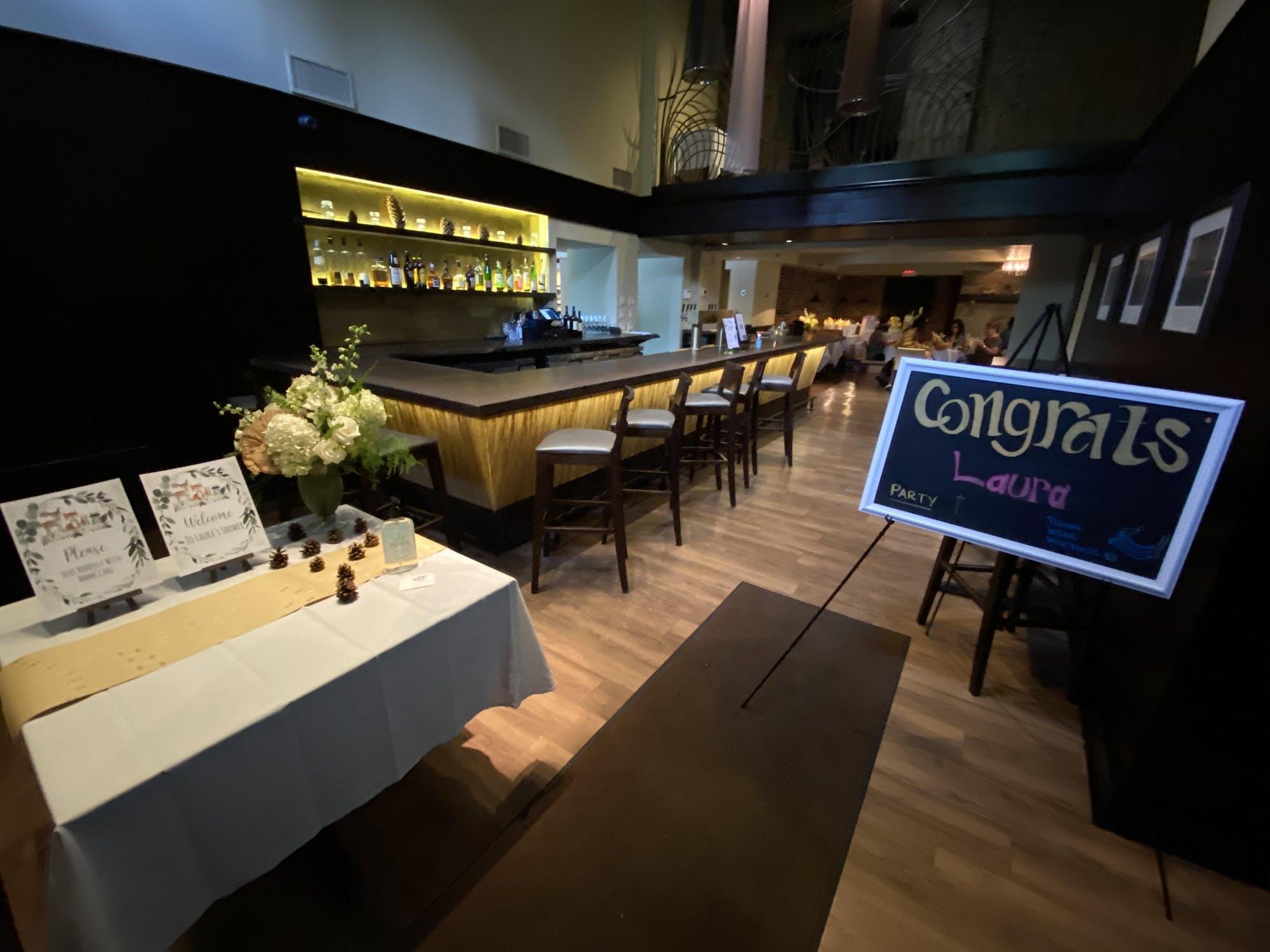 This space features a built-in cocktail table that may be used for seating, its own bar, and adjacent room that can be used for buffets or other miscellaneous decor. For parties of 60+, the rooms can be combined to create a larger floor plan.