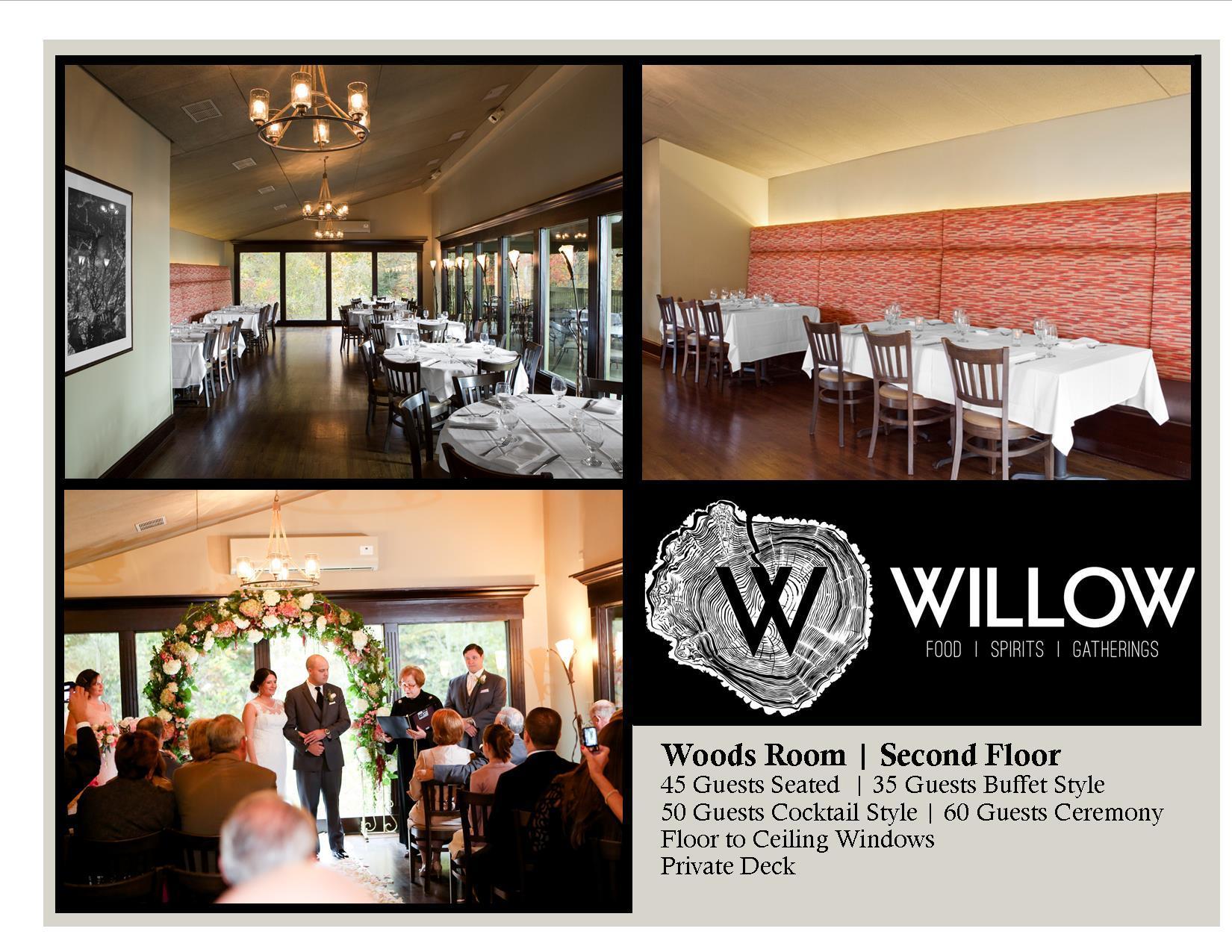 The Woods Room can host up to 40 guests and has a private deck and floor-to-ceiling windows along two walls. For parties of 60+, the rooms can be combined to create a larger floor plan.