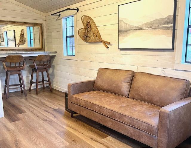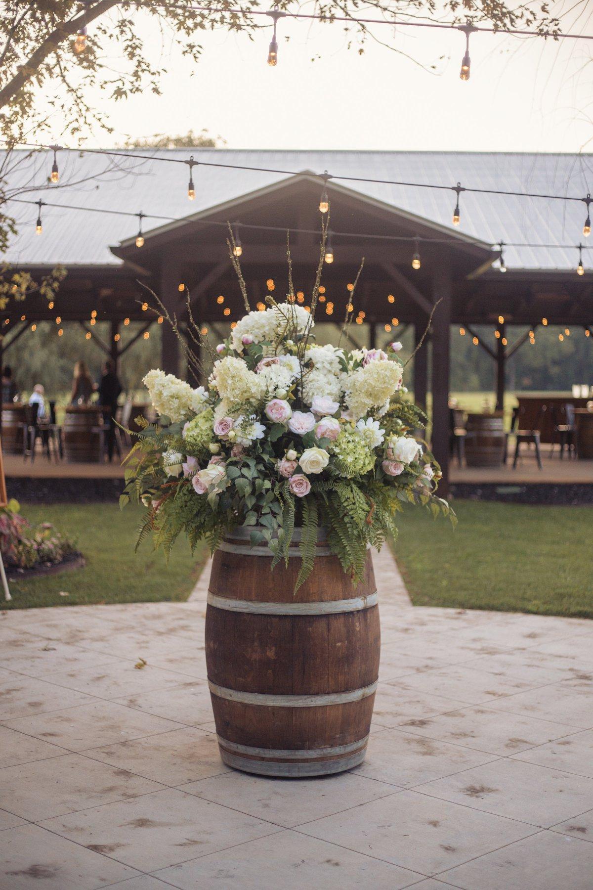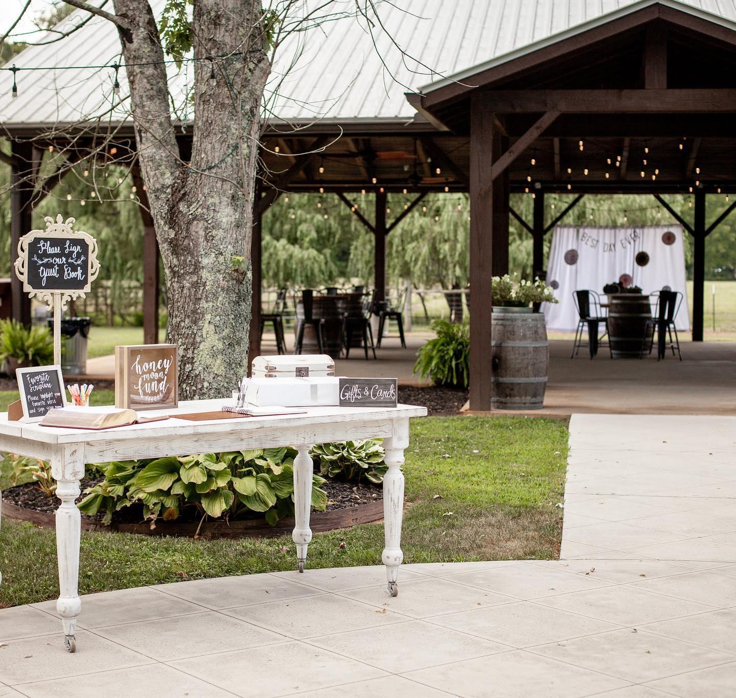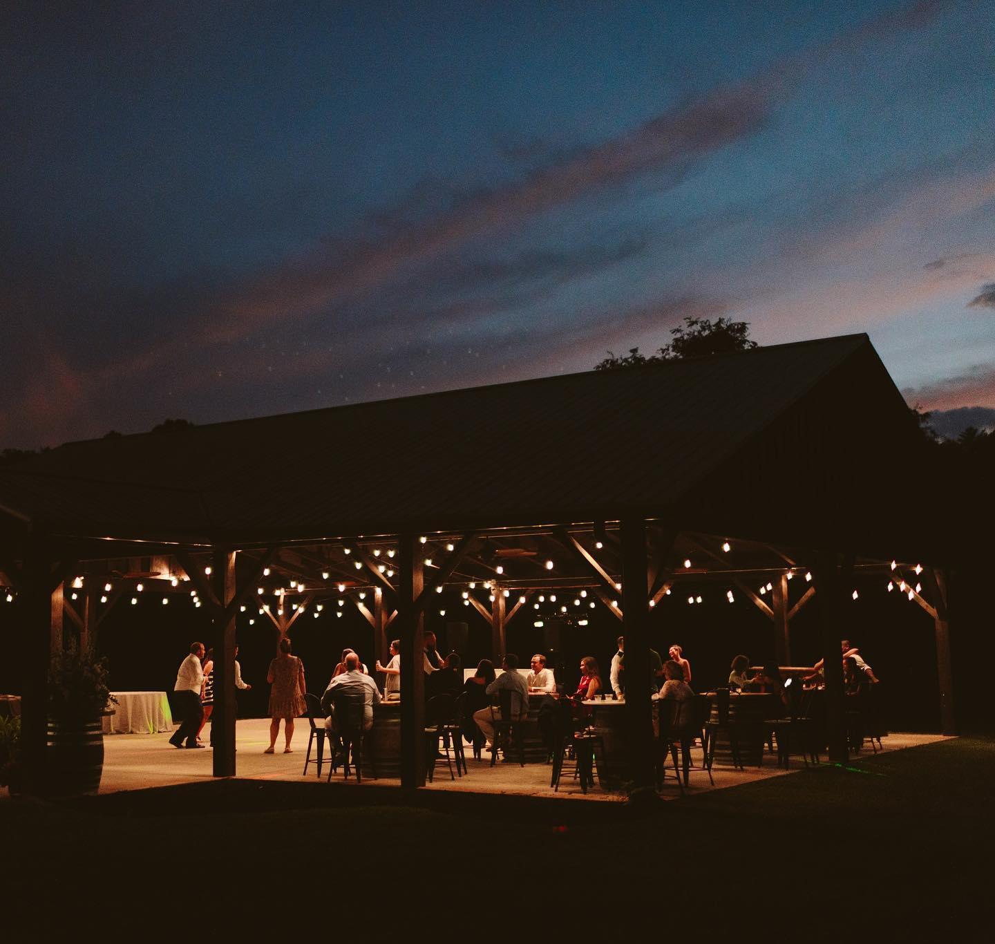 The pavilion is perfect for cocktail hour or a rain plan ceremony spot. This pavilion has 7 wine barrel tables and stools and a rolling bar. This space is adjacent to the main reception venue and the fire pit / swings.