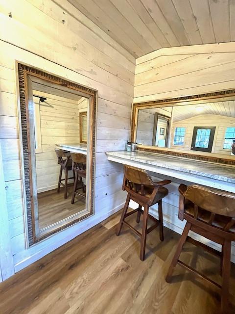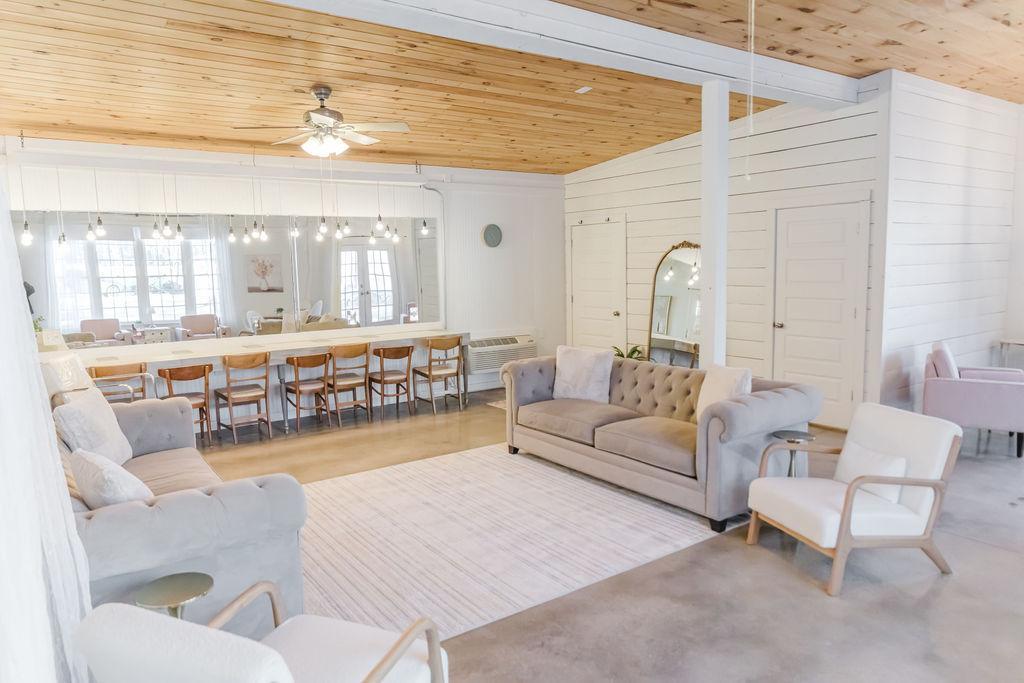 Beautiful bridal cottage with a 14 ft. beauty bar that will seat 8 bridesmaids so everyone can get ready at once. There is plenty of seating for everyone. This cottage has a private dressing room and a full bathroom. There is a table and sideboard also. This is a separate cottage adjacent to the main reception venue.