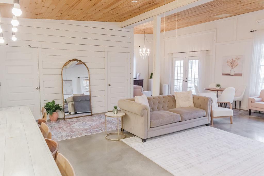 14 ft. lighted makeup bar with seating for 8. Salon chair for the bride 2 sofas, 5 upholstered chairs Table and 4 white leather dining chairs Antique sideboard Gold floor mirror Private dressing room Full bathroom