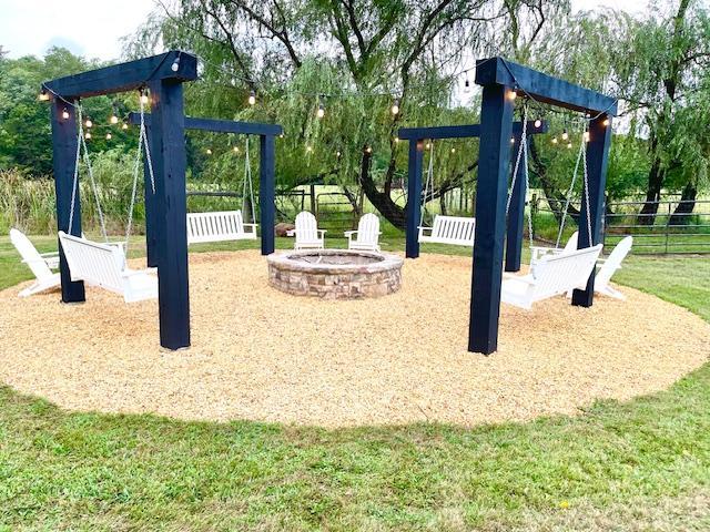 Beautiful fire pit surrounded by swings, Adirondack chairs and cafe lights.