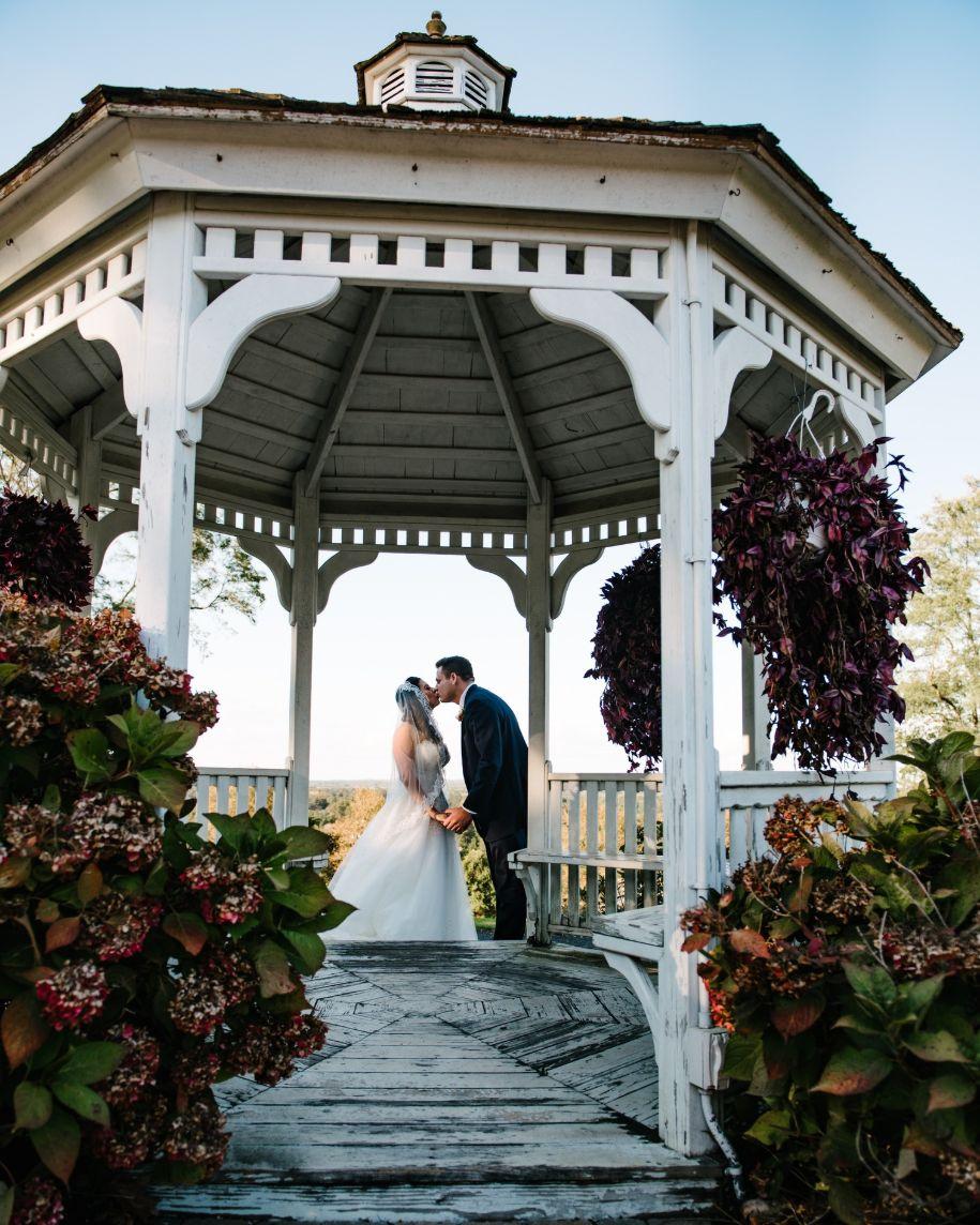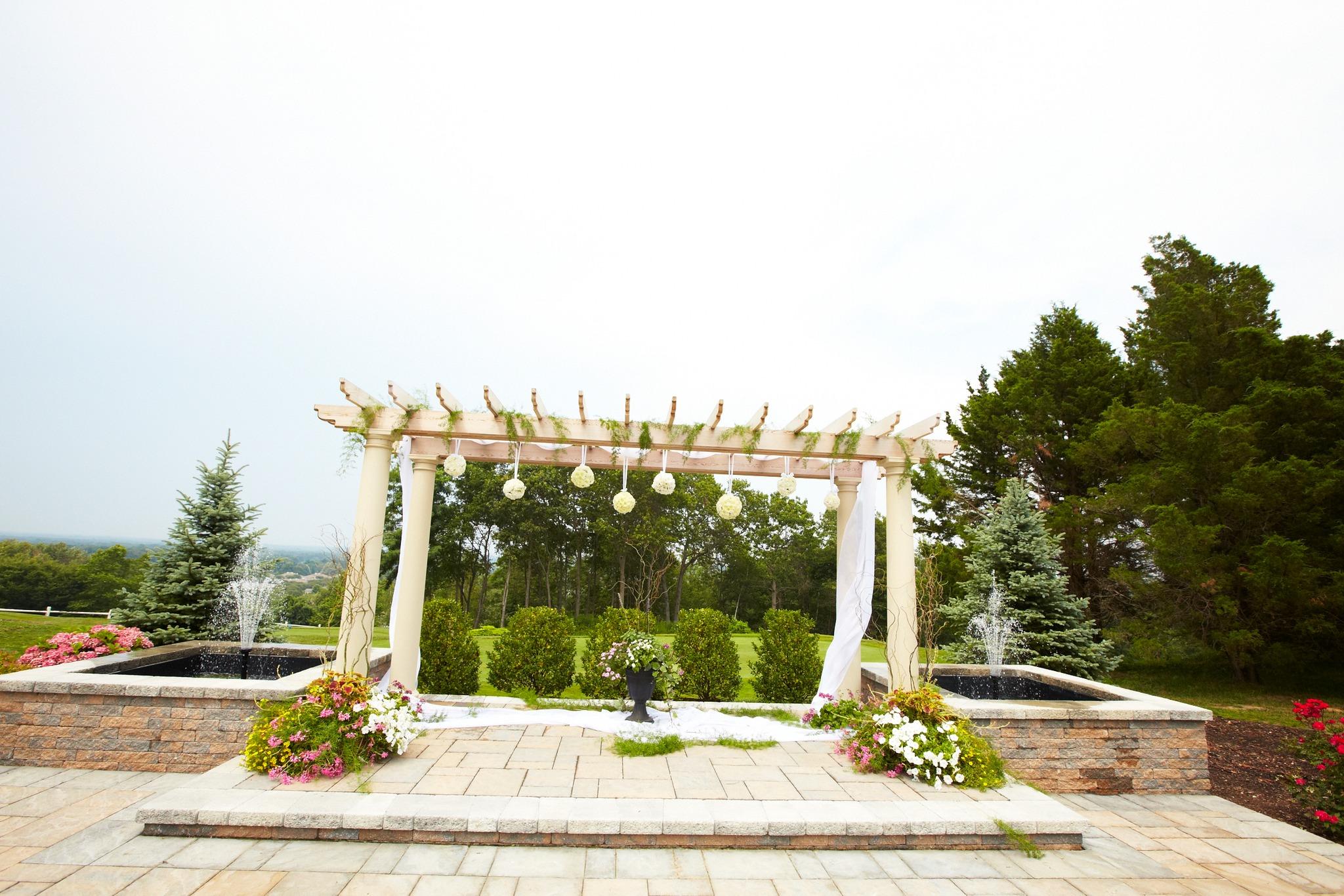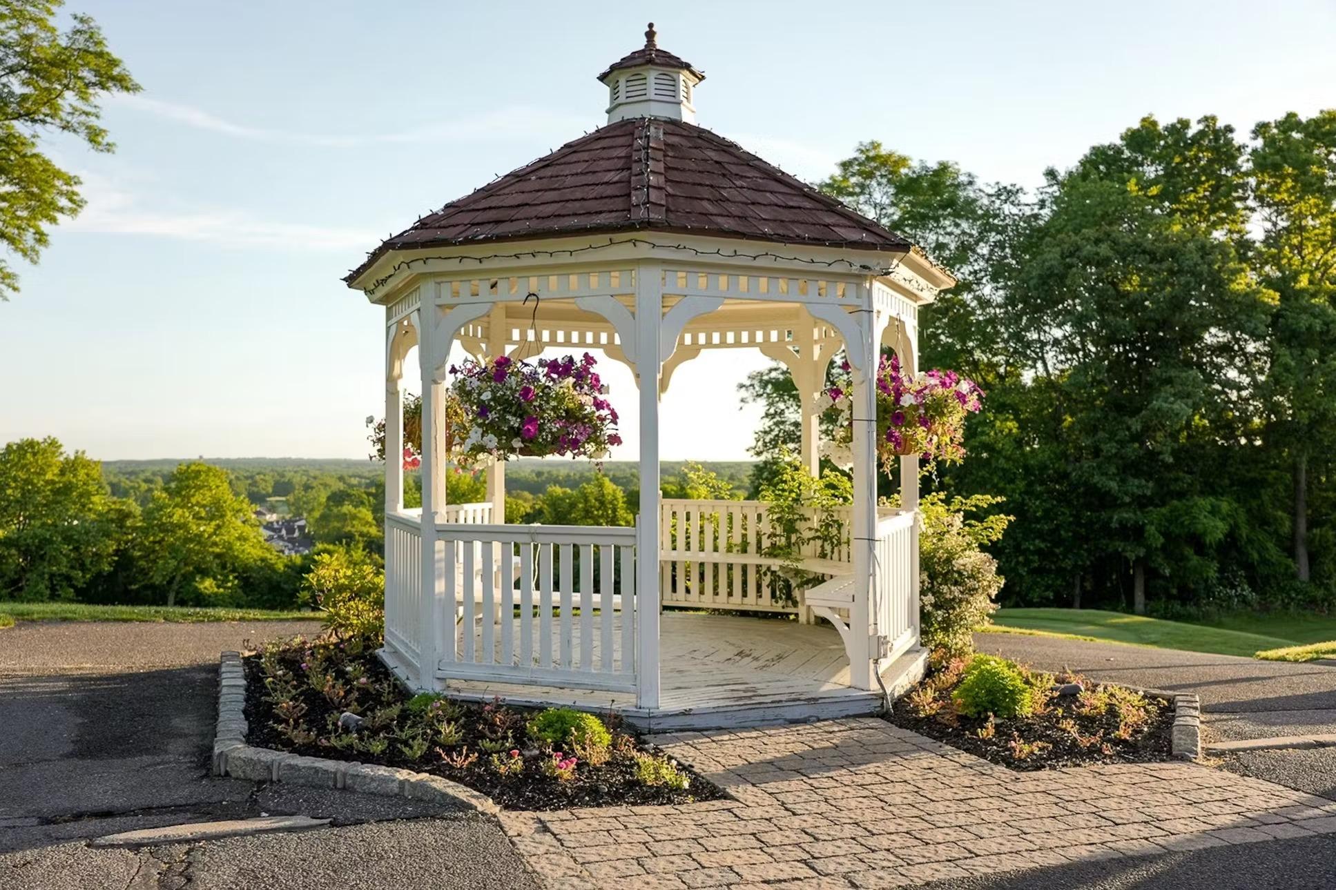 This venue features multiple stunning outdoor locations. Exchange vows under a romantic, white wooden gazebo tucked away in lush gardens, offering a charming and intimate setting for photos. Or, opt for a grander backdrop at the elegant stone pergola, beautifully accented by flowing drapery, hanging florals, and the tranquil sound of two flanking water fountains. Both spots offer a picturesque start to your forever, surrounded by pristine landscaping and breathtaking vistas.