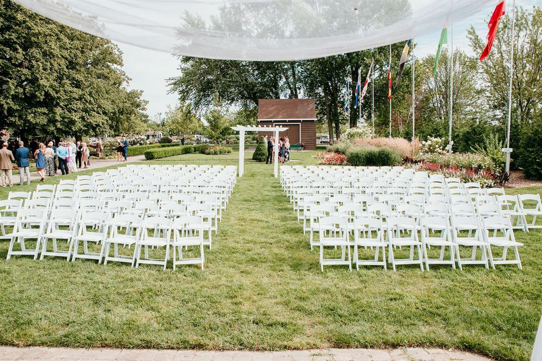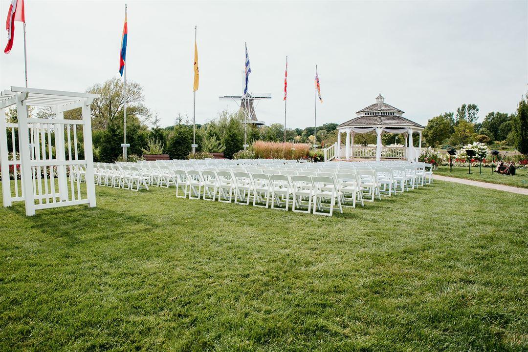 Wedding Package Includes: Beautiful Outdoor Setting Ceiling Fans for Excellent Comfort Control Complimentary Entrance to Windmill Island Gardens for Guests Complimentary Parking for Guests Gorgeous Wedding Gazebo for Ceremony Inclusive Set-Up and Take Down Manicured Floral Gardens On-Site Bride and Groom's Rooms On-Site Facility Attendant for Rehearsal, Ceremony, and Reception One-hour rehearsal for those having their ceremony at the Island Round Tables for Seating up to 8 Guests White Wedding Chairs for Ceremony White Wedding Chairs for Reception White Wedding Pavilion with Draped Fabric Lining