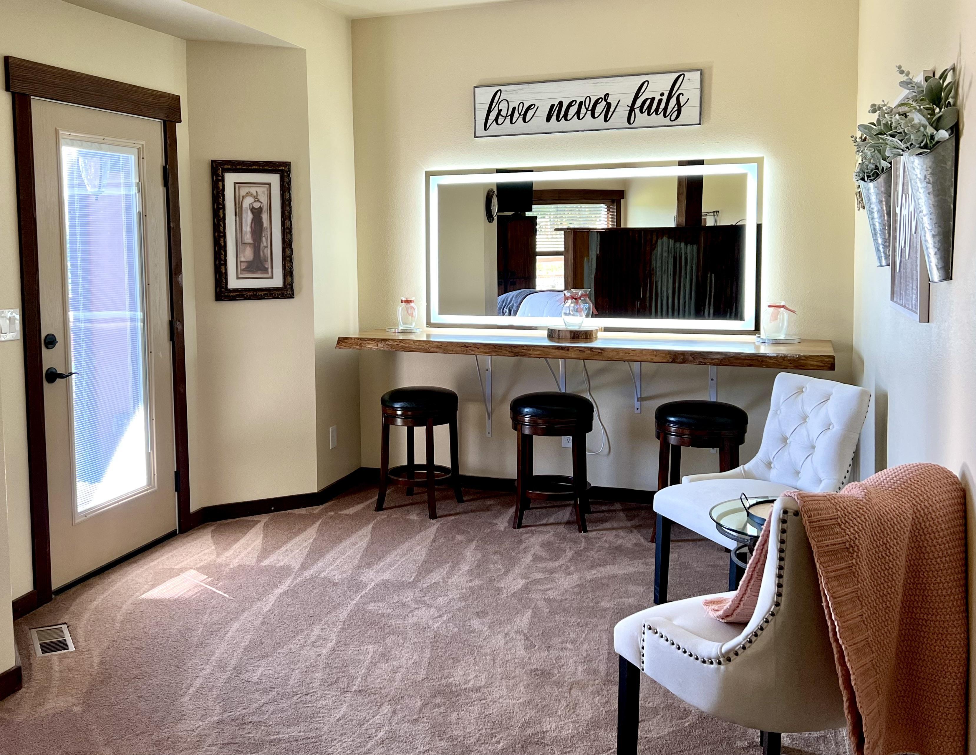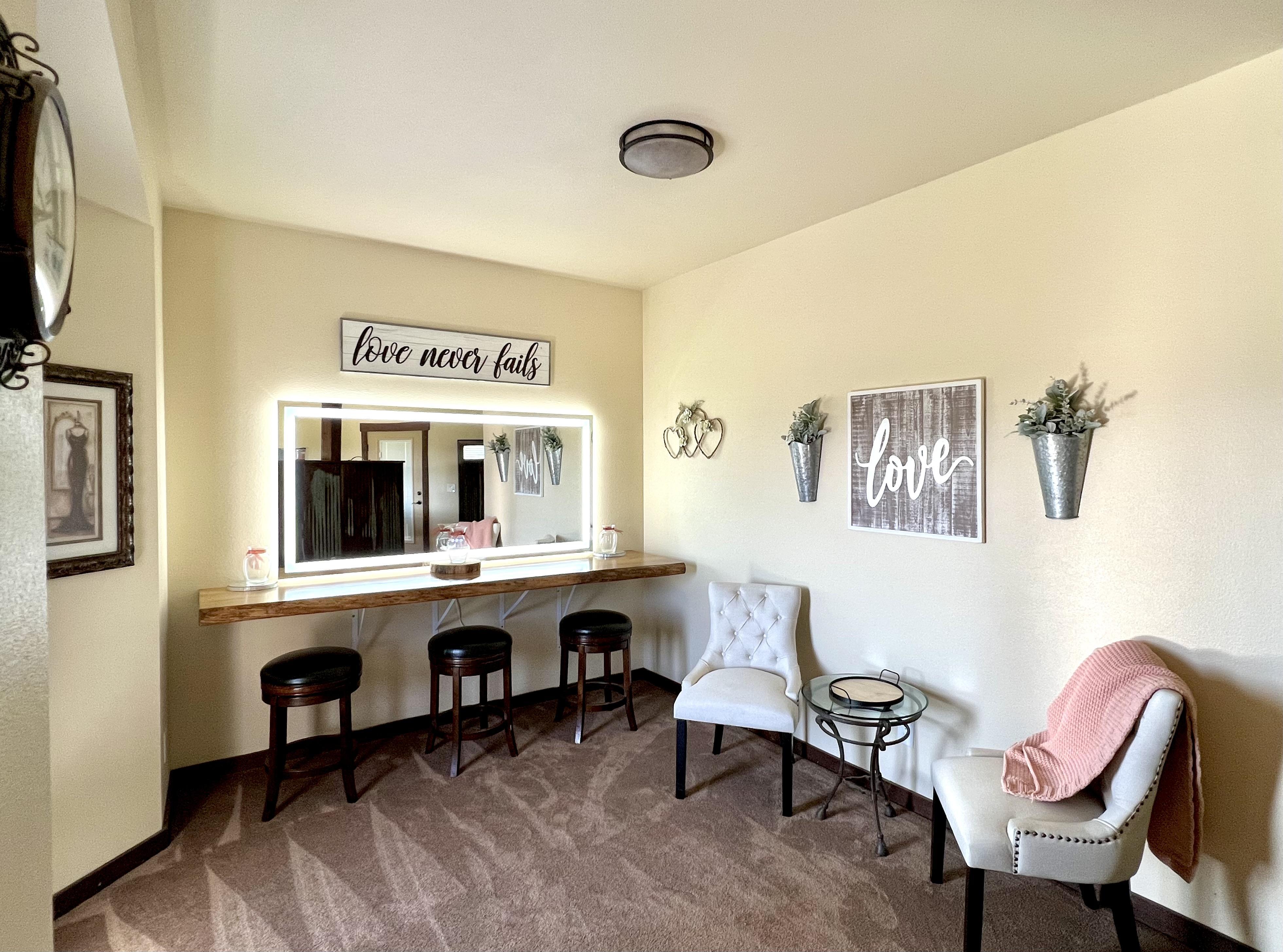 The bridal suite is a private space with vanities/mirror for at least three ladies. There is a private bathroom with vanity and mirror as well. This room is also divided into a sleeping room that would be ideal for the bride to stay in the night before the wedding and the bride and groom to share on their wedding night. There is an exterior door that exits to the deck and down to the ceremony area. Vote a short video at https://youtube.com/shorts/ru-b8Tq3LPU?si=Z1D8aQ4xbHIe28h3