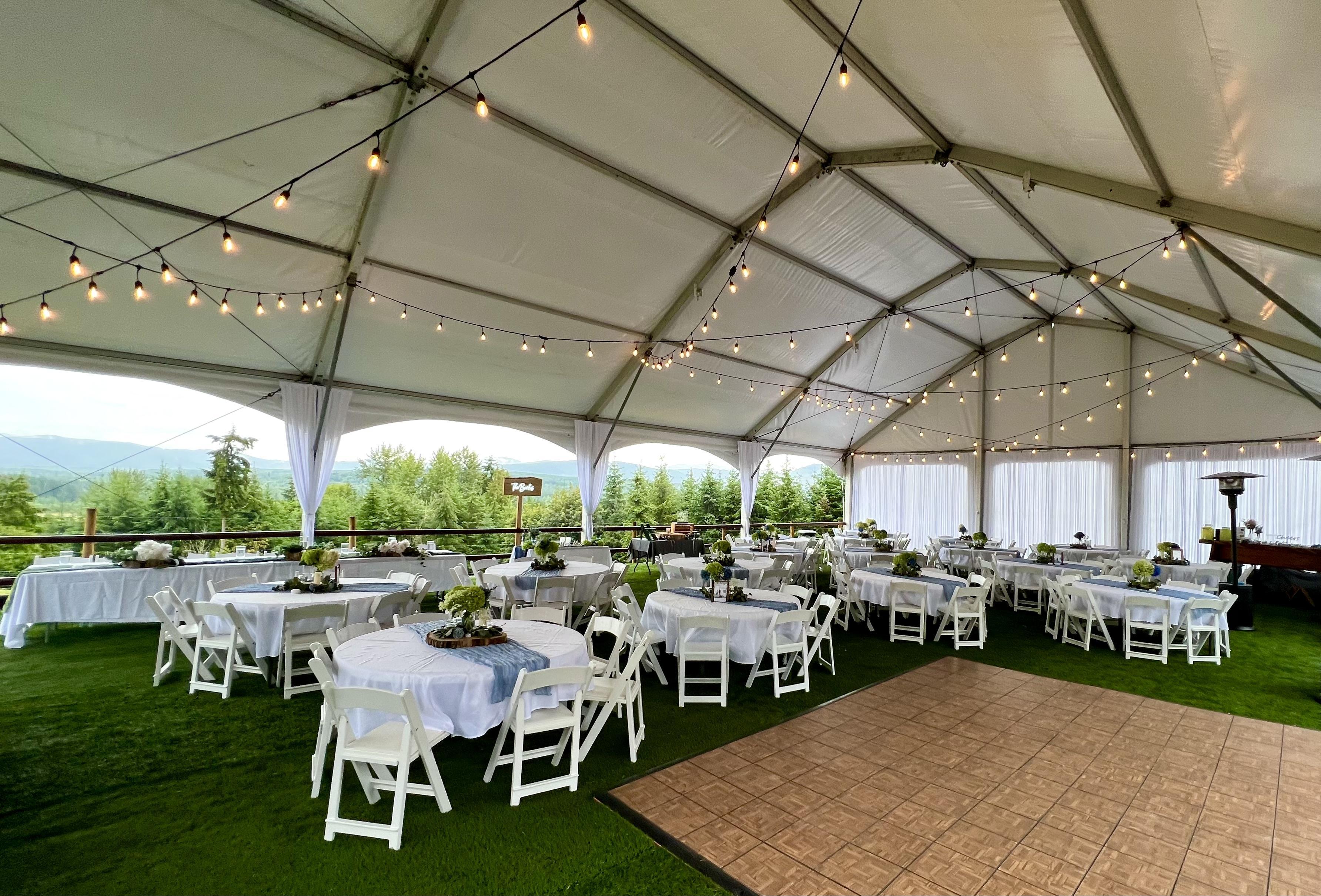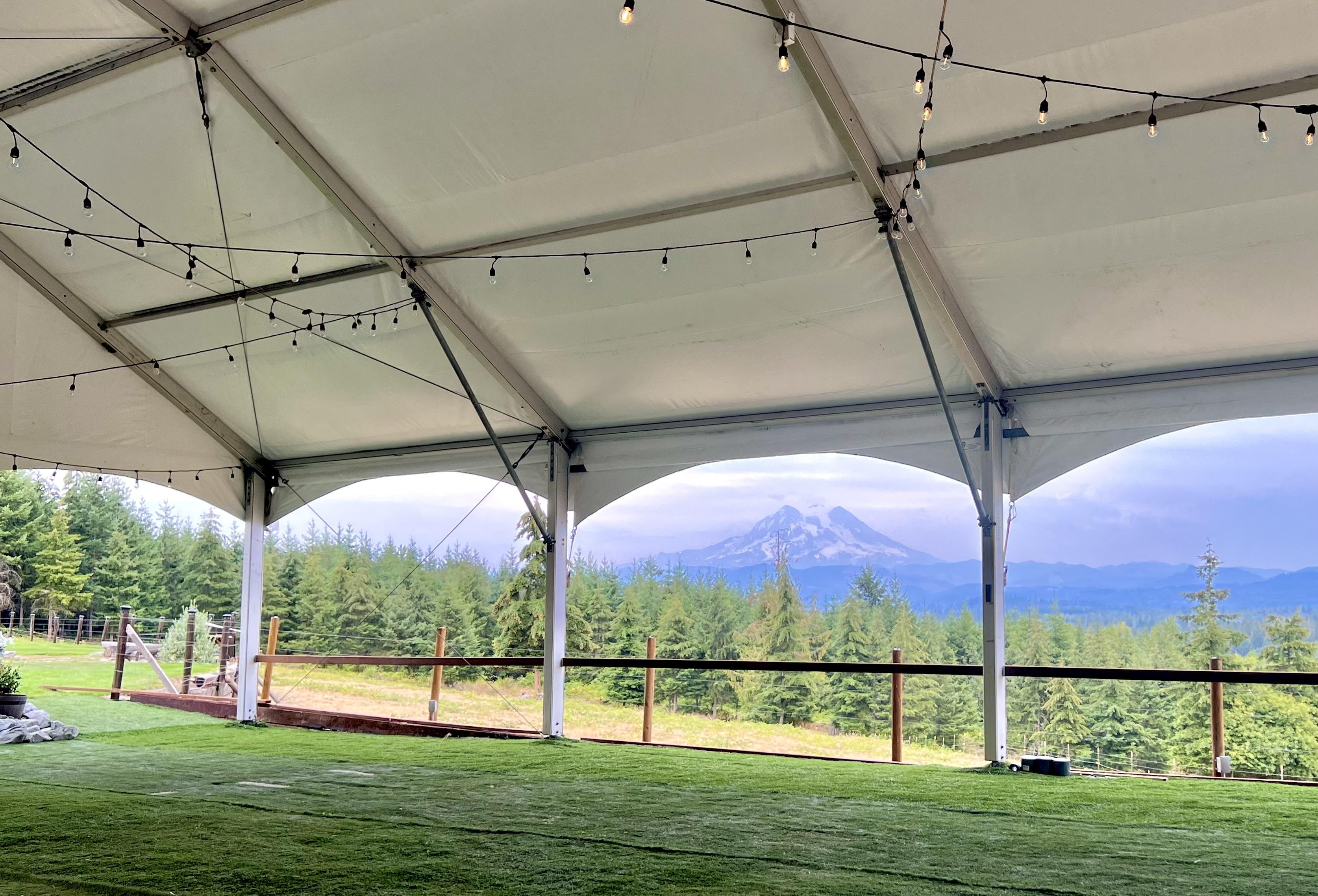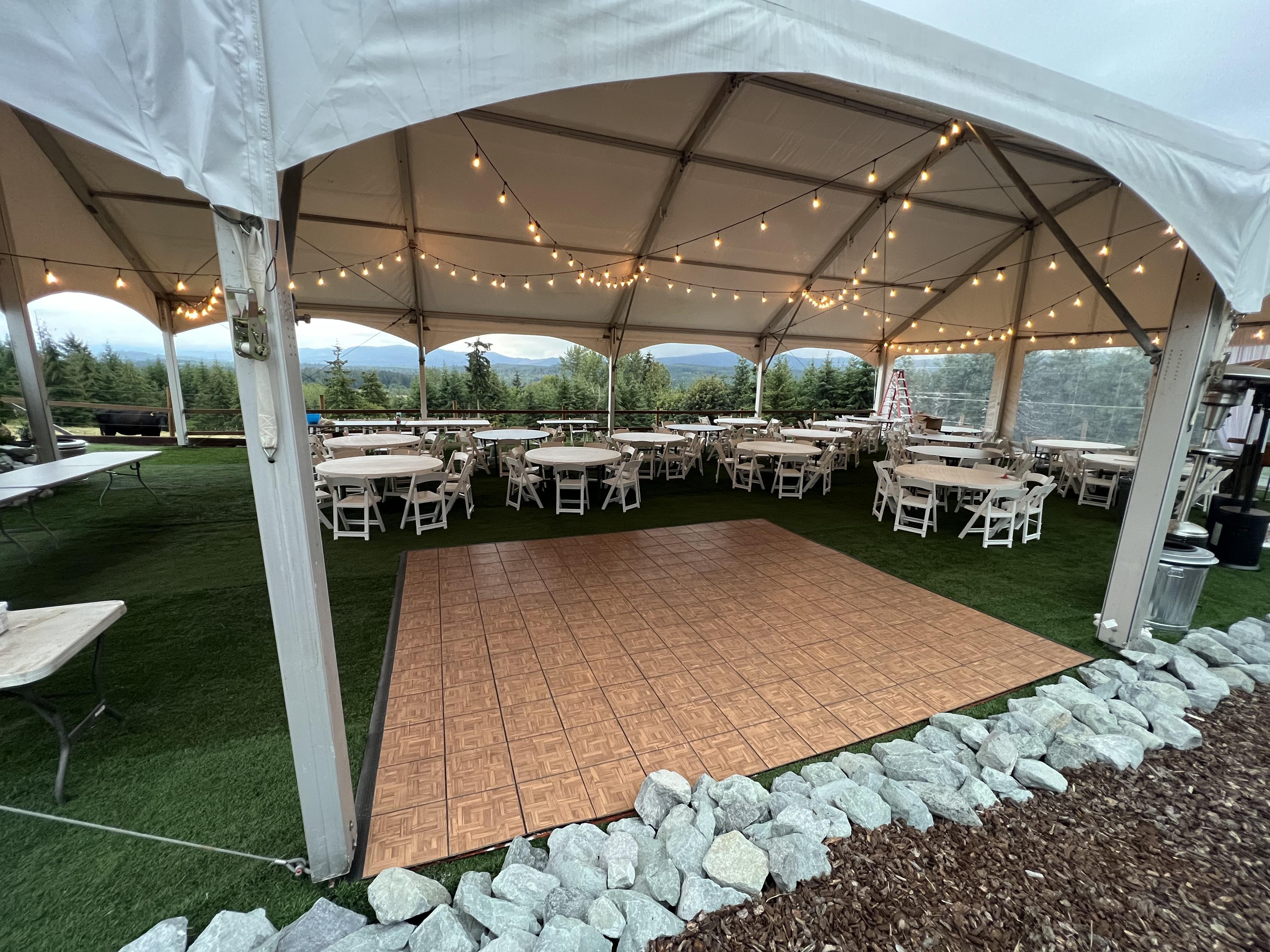 - Turf/artificial grass floor - Access to power and water (non-potable) - View of Mt. Rainier - Lighted with LED bistro light strings - Some white fabric accents on posts and back wall - Dance floor