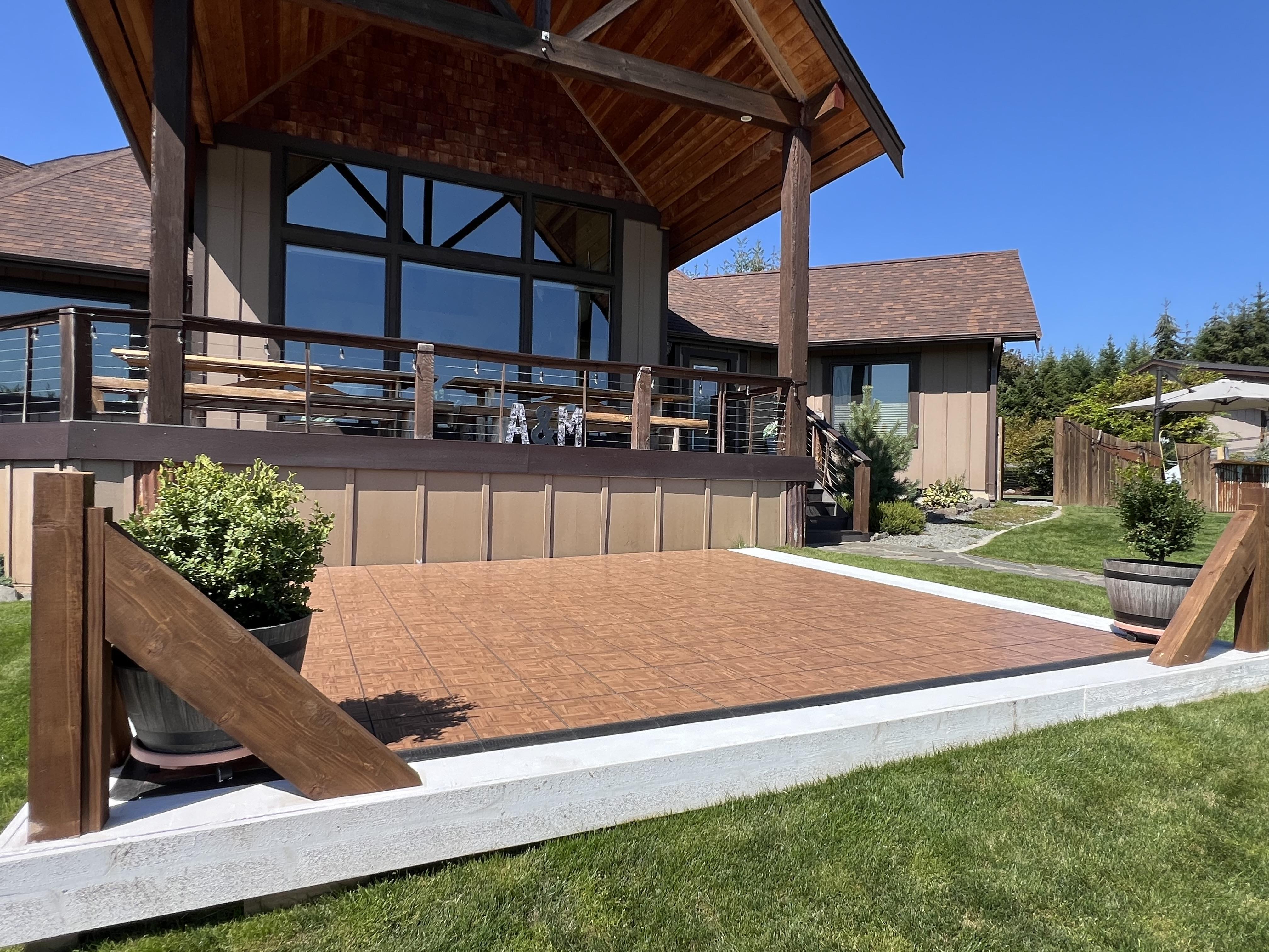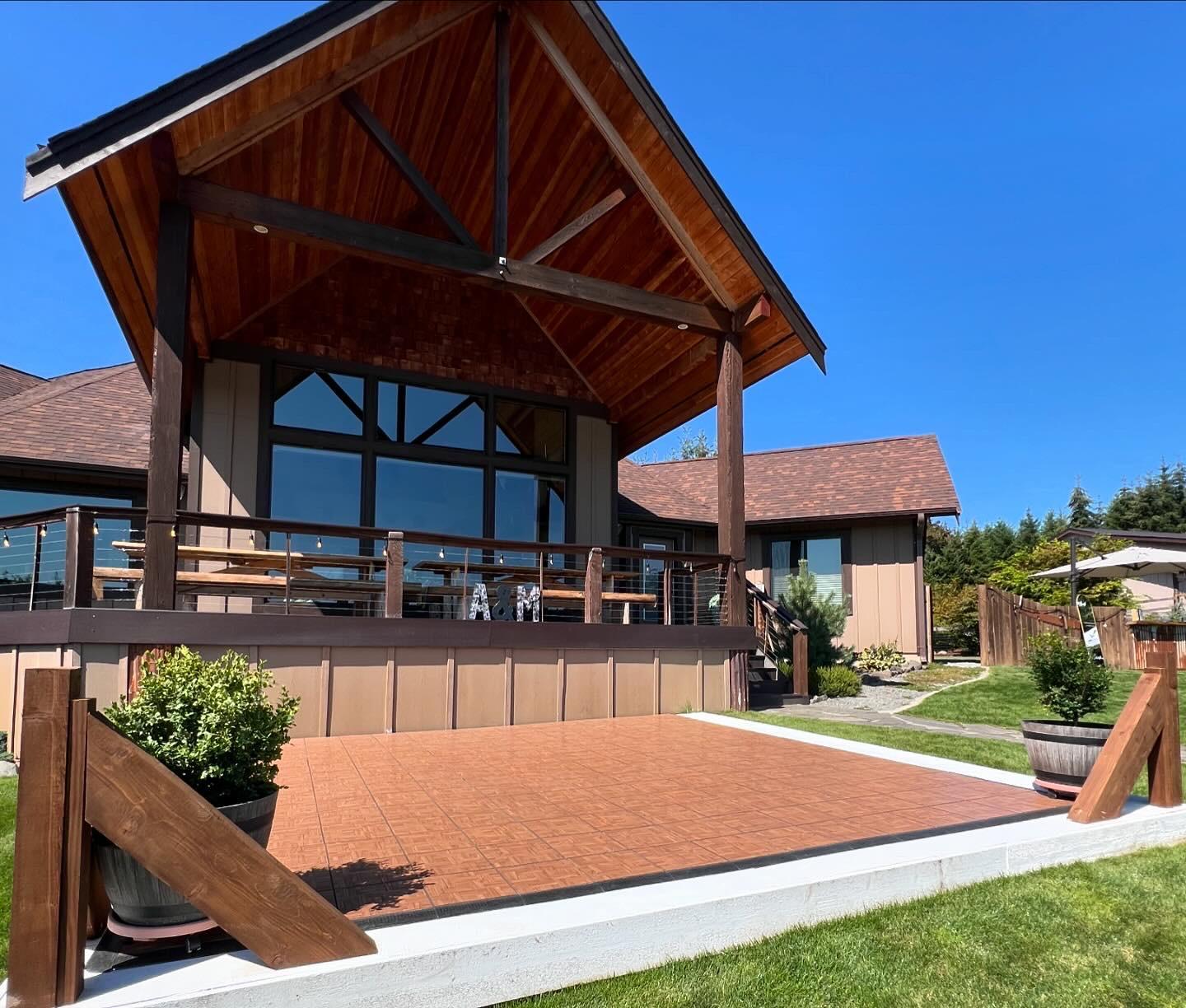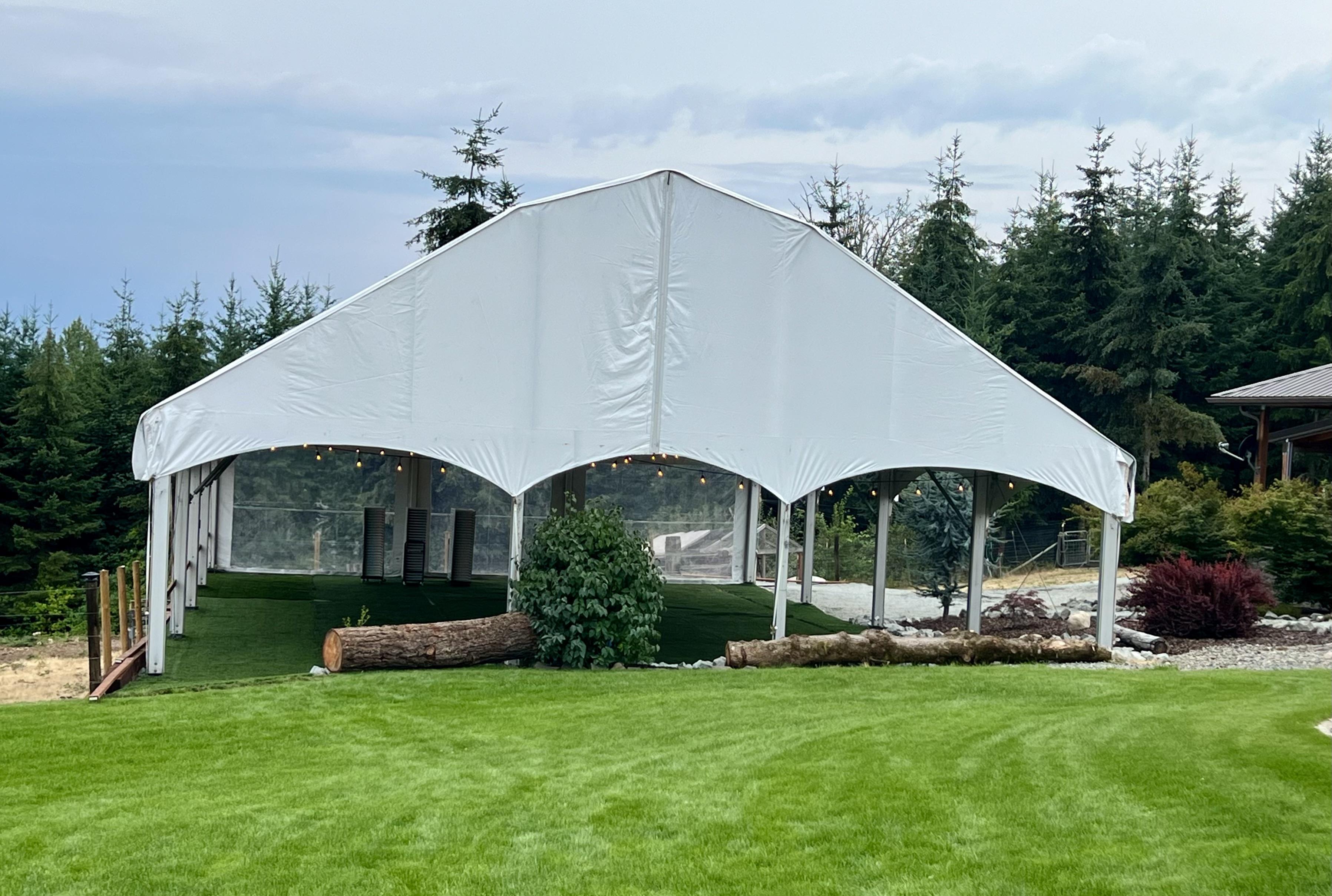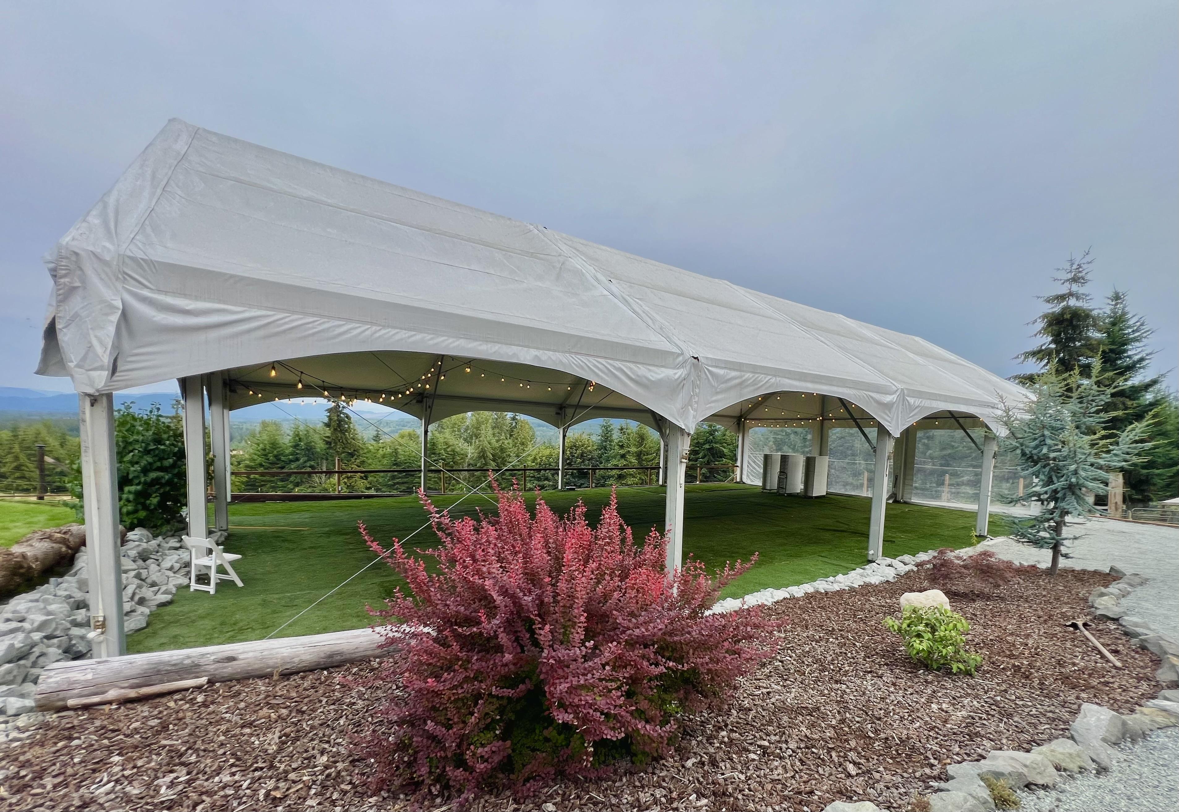 - Turf/artificial grass floor - Access to power and water (non-potable) - View of Mt. Rainier - Lighted with LED bistro light strings - Some white fabric accents on posts and back wall - Dance floor