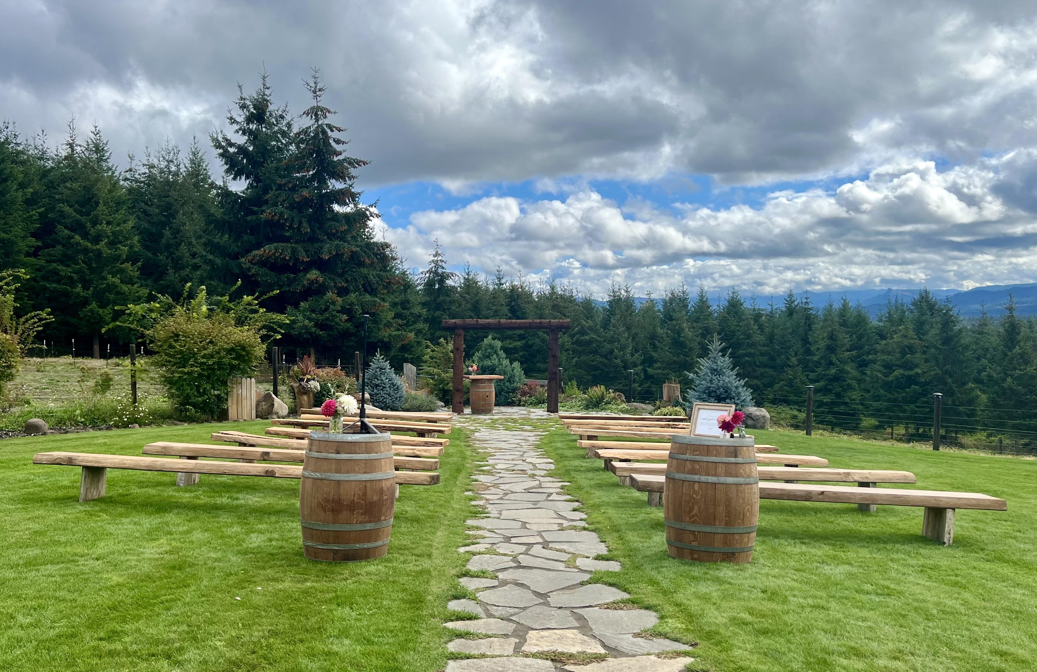 This space features a stoned pathway to a flat ceremony area that overlooks the valley with a view of Mt. Rainier. There is a capacity to host 150 guests (including wedding party) with chairs and benches.