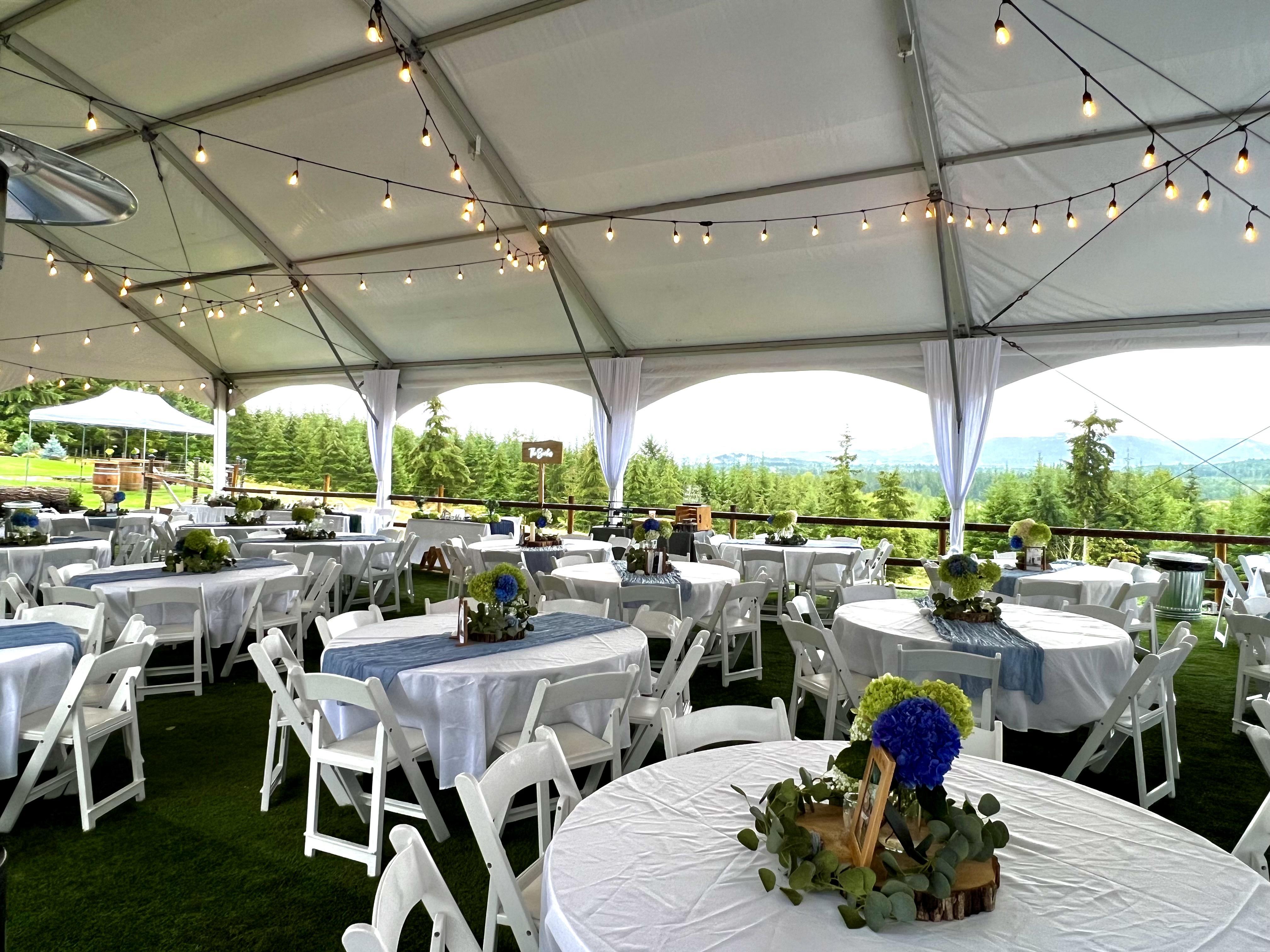 This space features a 2400 square foot reception space covered by an airy elegeant white tent structure. With open sides, the view of Mt. Rainier is still as spectacular as ever. This space can easily hold your wedding guests, buffet line, bar, dance floor and DJ.