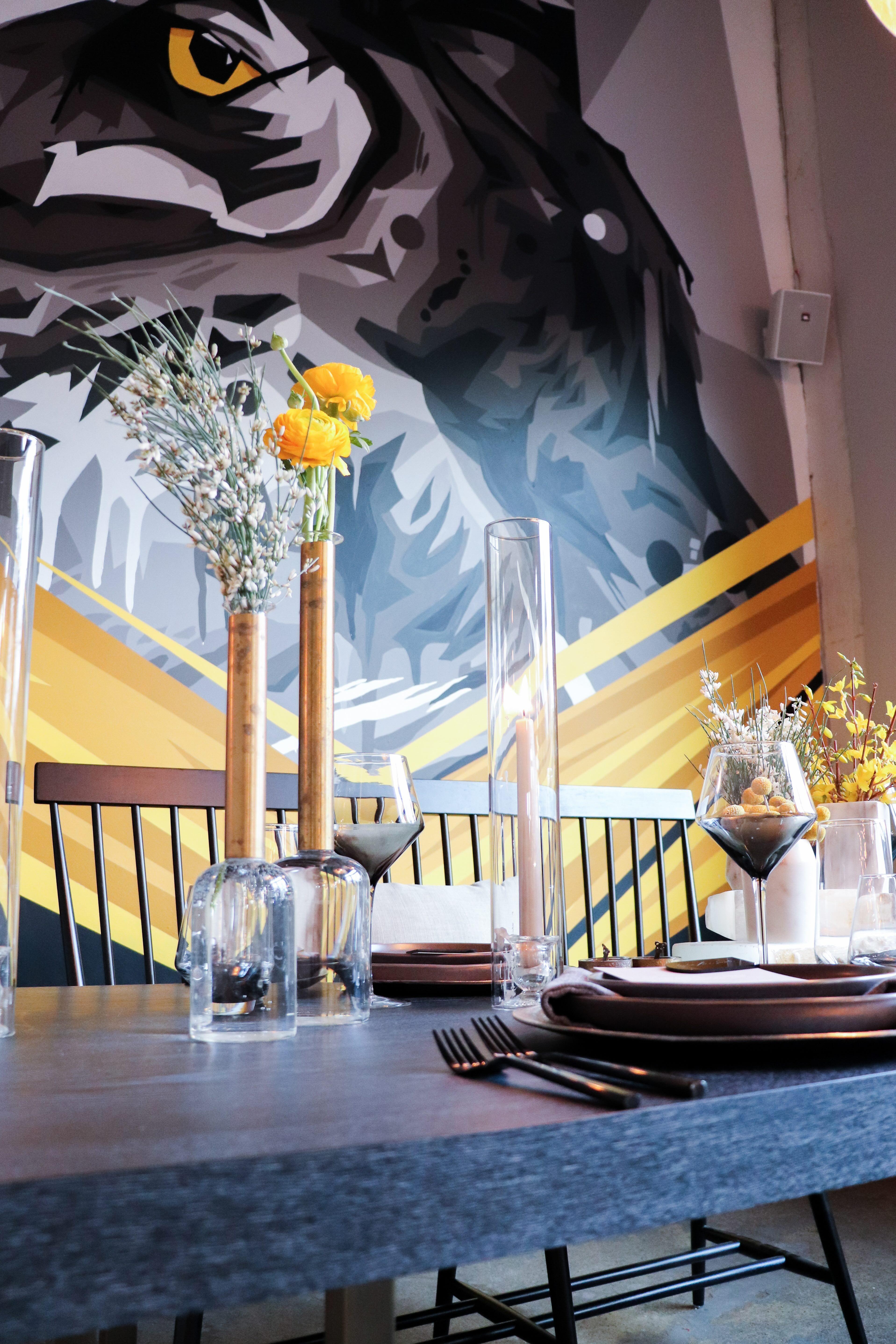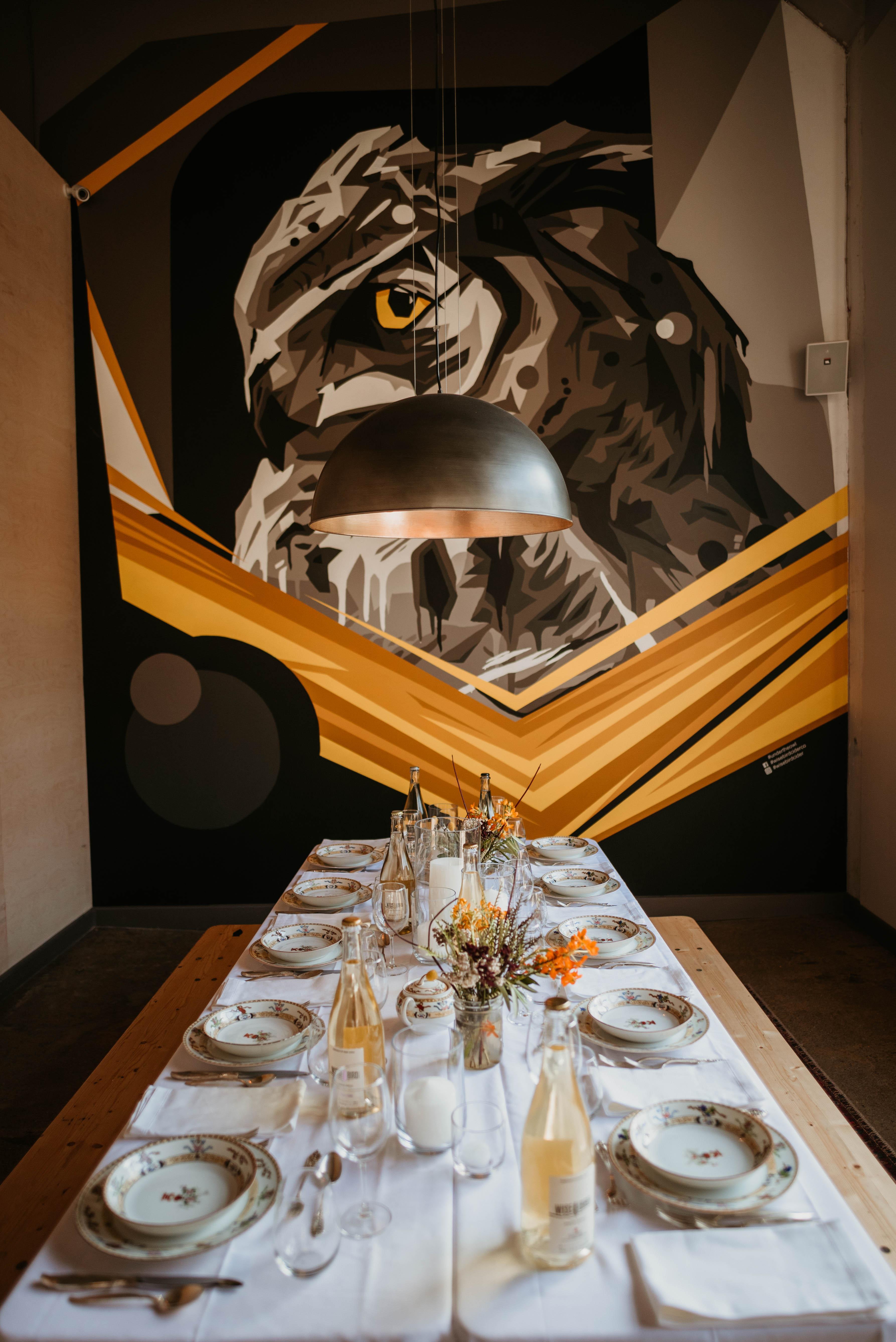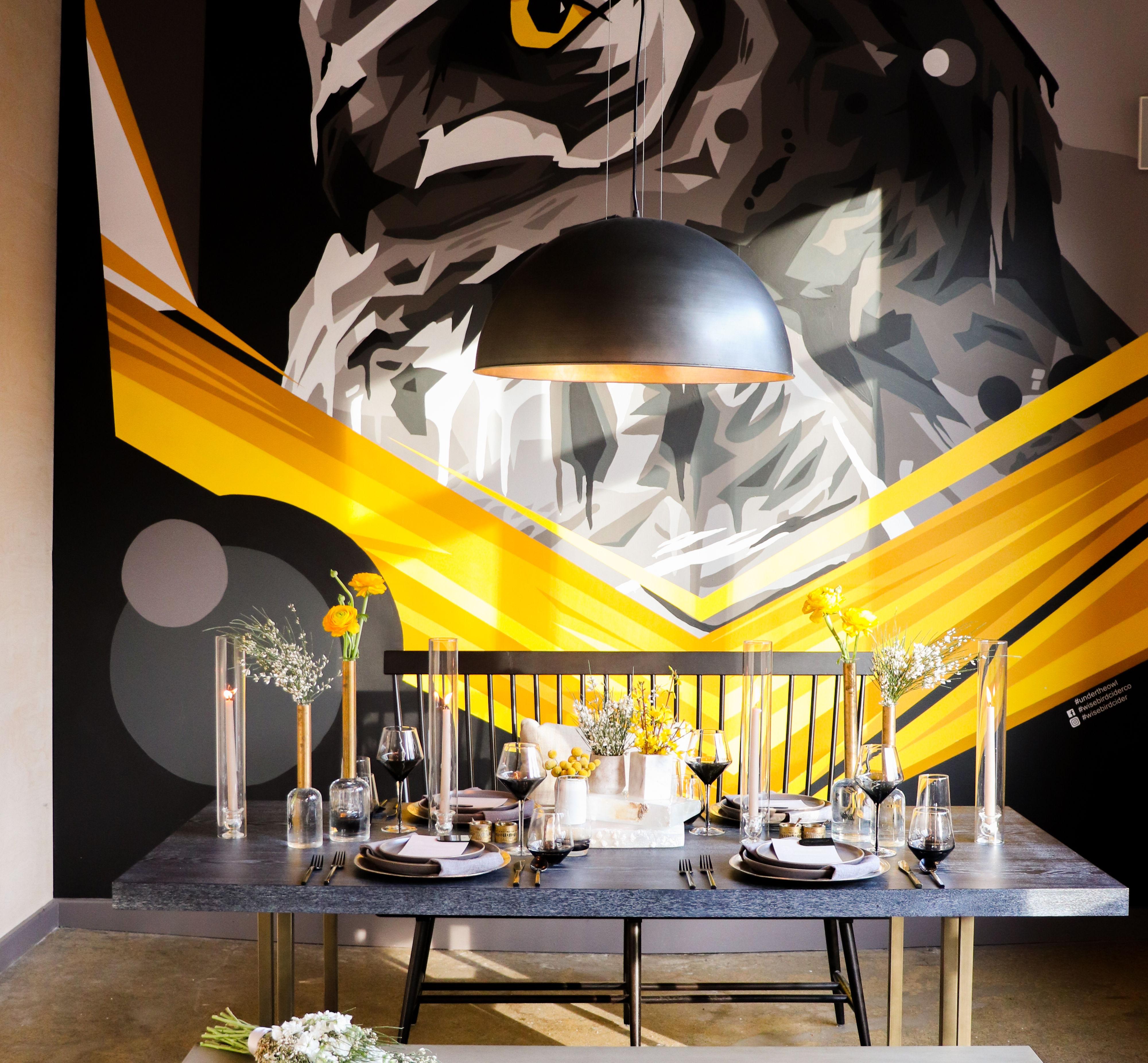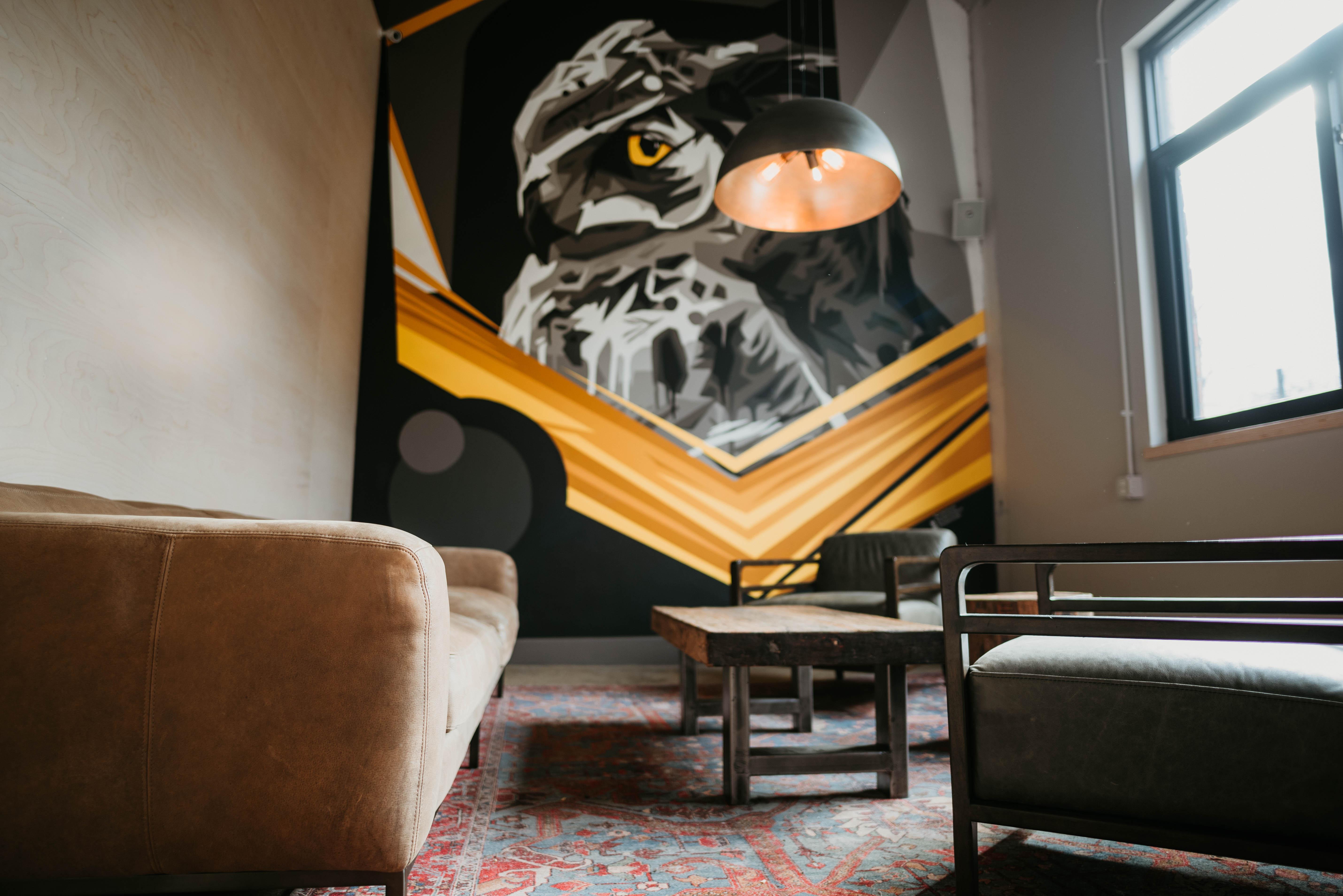 Our Owl Lounge features a 20 foot mural and can be arranged as an intimate living room or dining area.