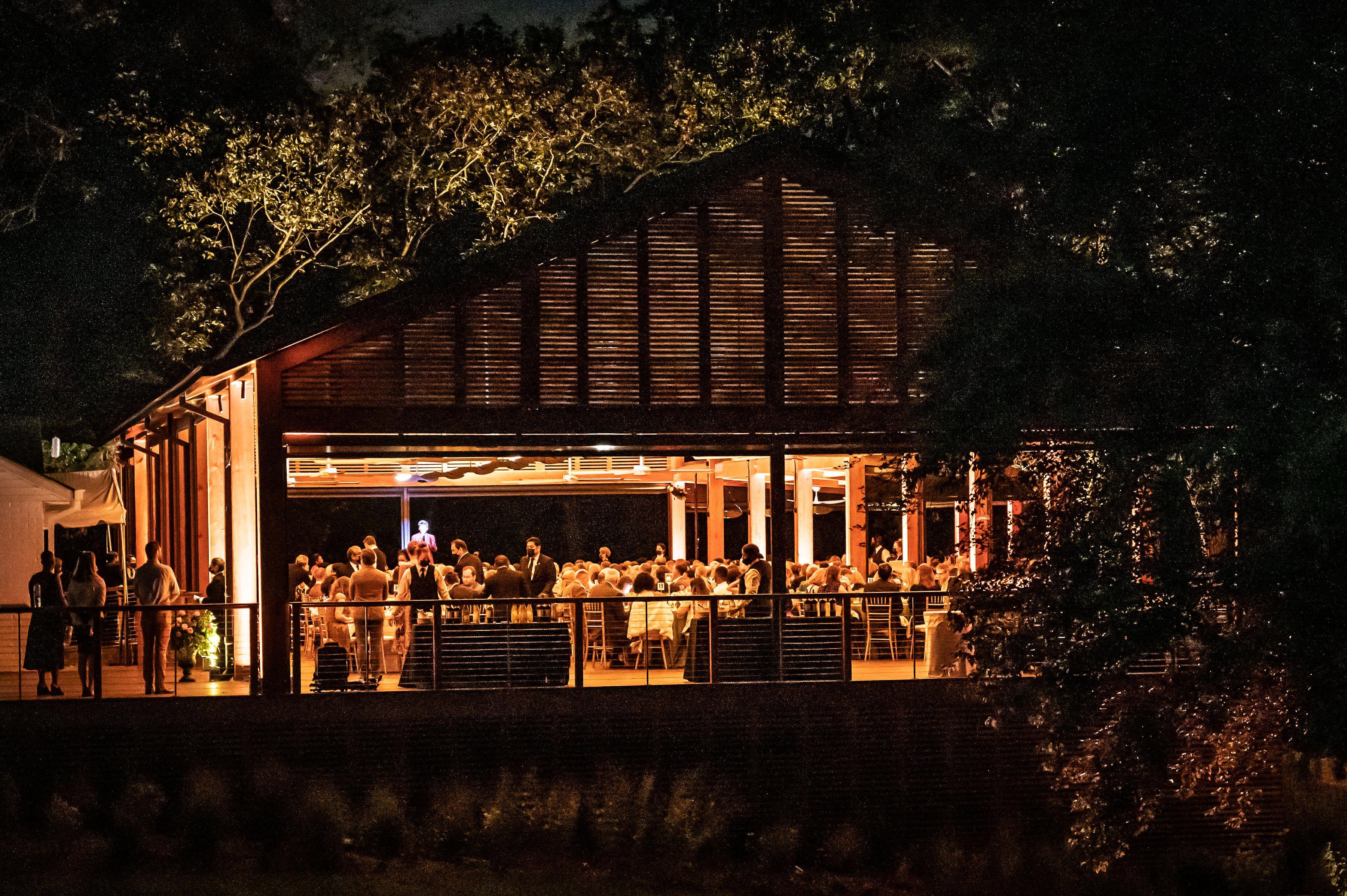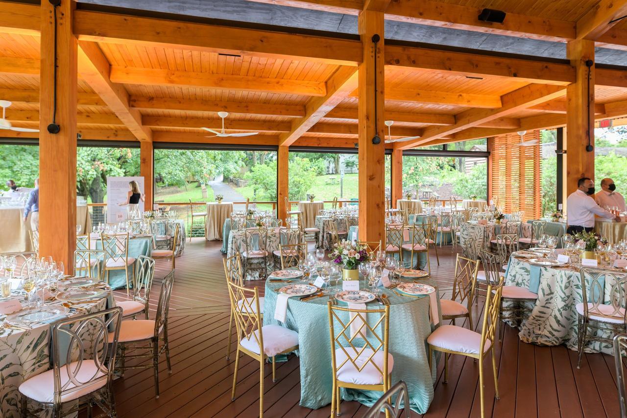 The Ovations Pavilion is one of Wolf Trap's larger spaces. It can hold 250 people seated with a dance floor, or up to 400 person cocktail reception. The space has ample power for a DJ or band, a large catering kitchen with optional built-in bar, multiple ceiling fans, and weather screens for protection against rain or sun. The Ovations Pavilion also offers a beautiful view of the meadow and the woods beyond.
