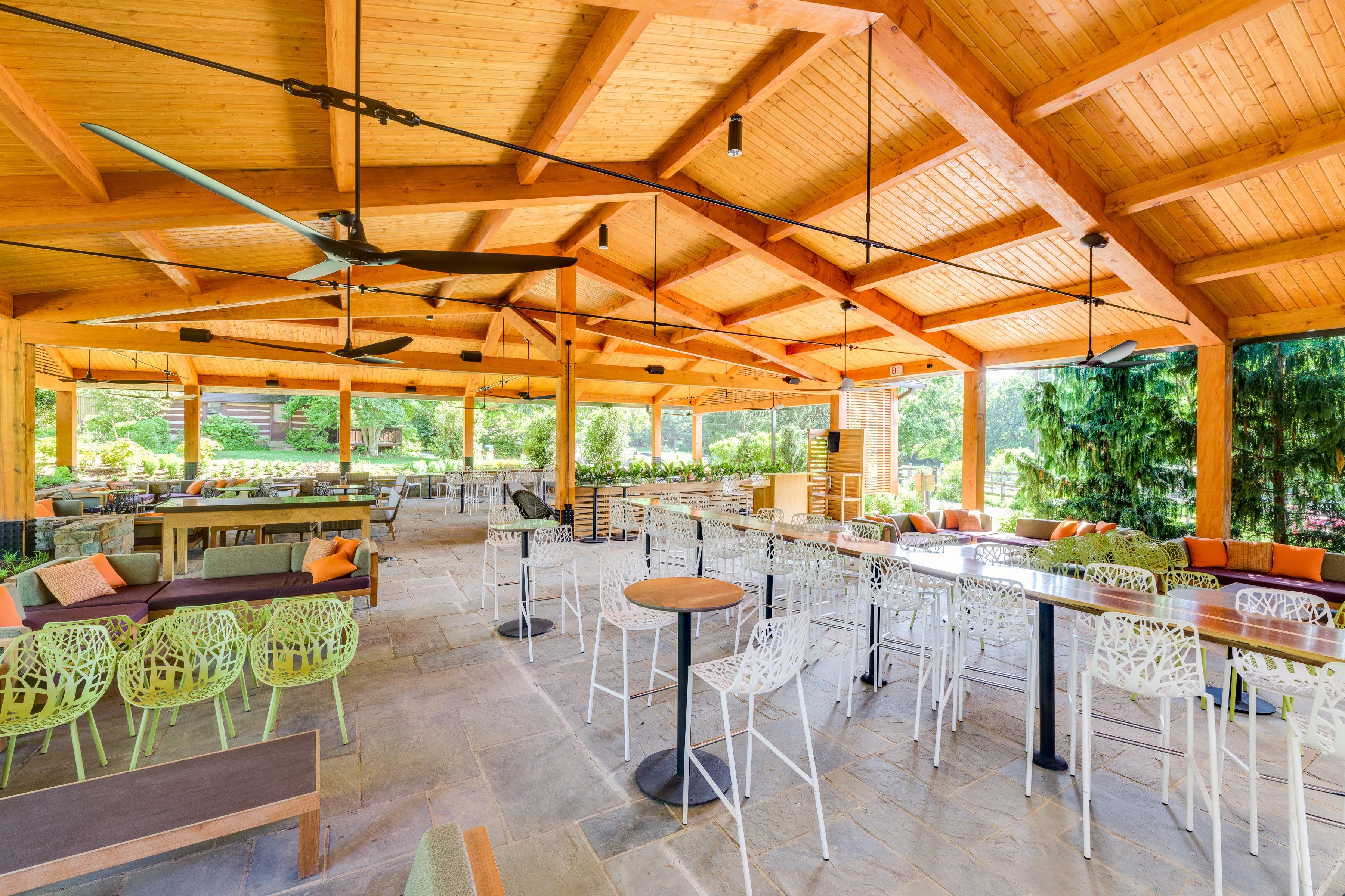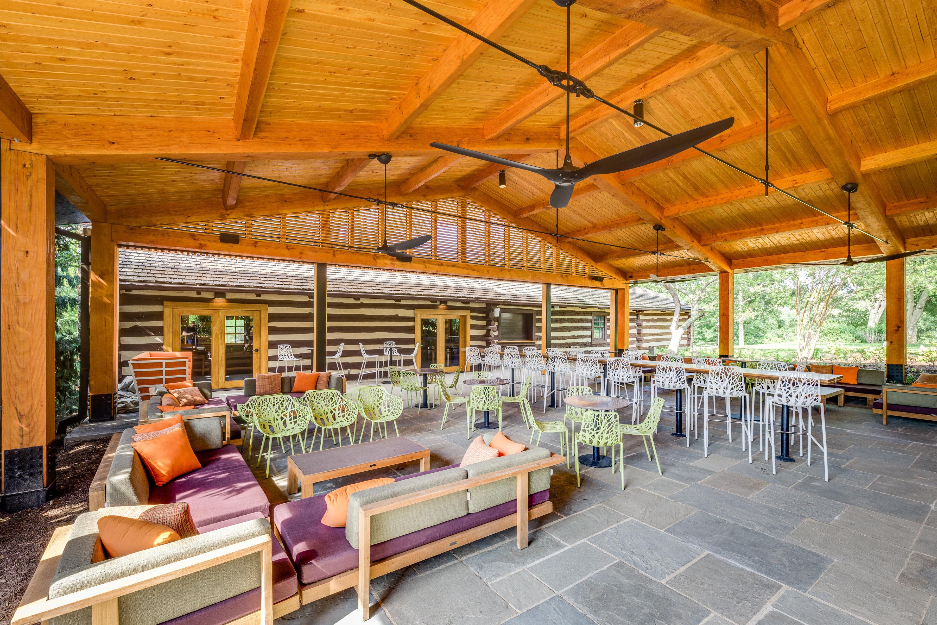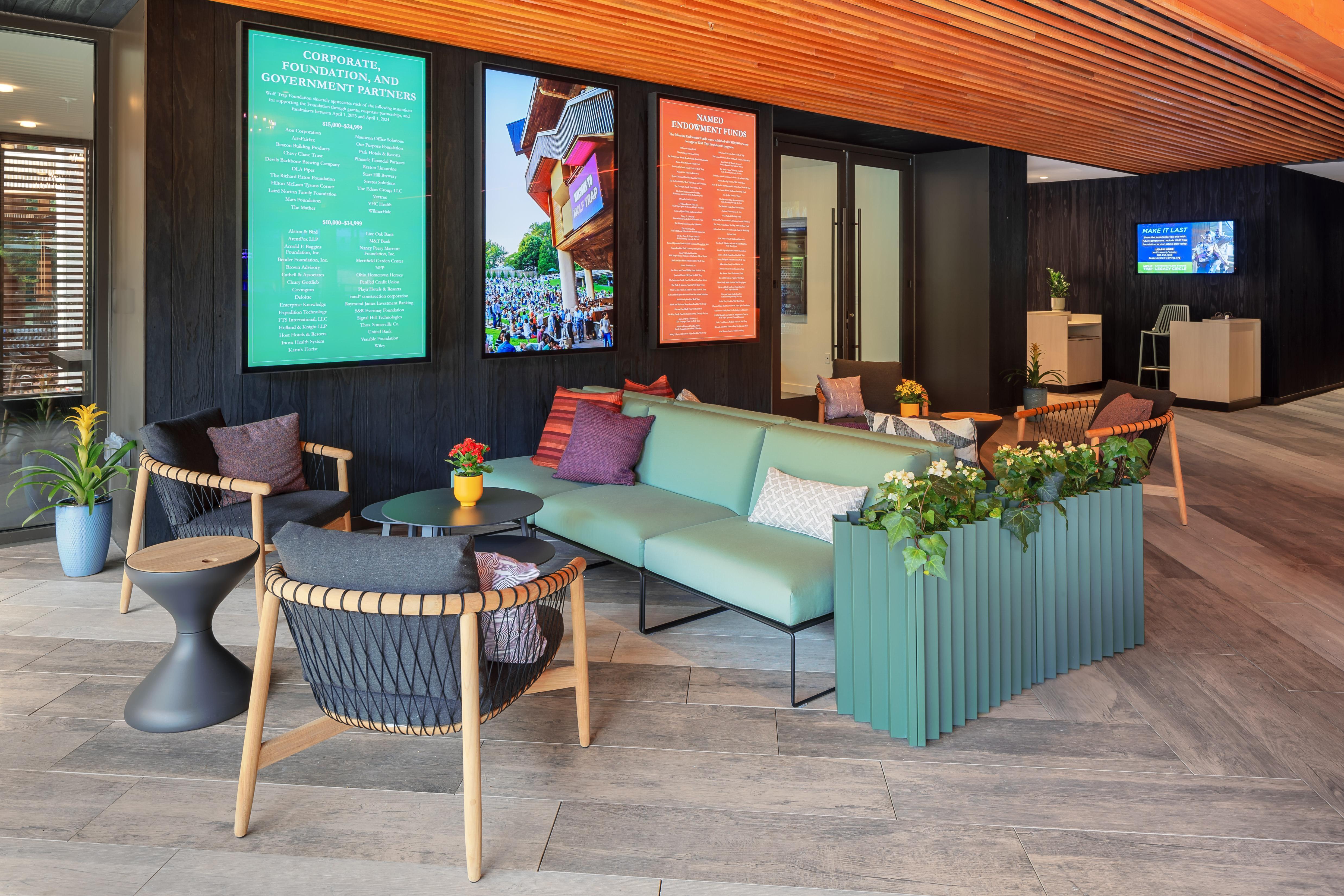 The event ready Encore Circle Lounge provides a cozy and relaxed atmosphere for guests to unwind and enjoy the beauty of Wolf Trap National Park.
