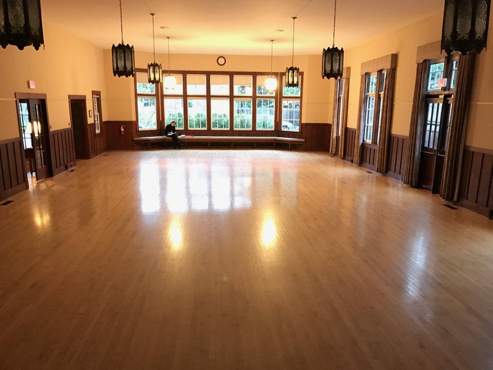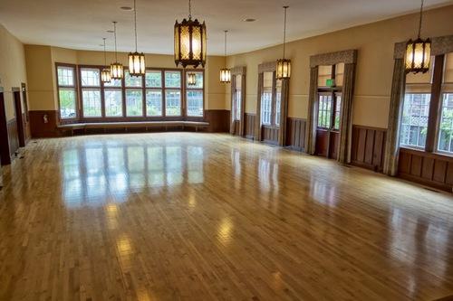 The Clubhouse is ideal for gatherings of up to 100 people. The building, designed by Charles E. Hodges was constructed in 1916. The Clubhouse is a lovely venue for private parties, weddings, recitals and off-site meetings. Guests enter through a charming portico on Homer Avenue into a spacious foyer. The main room is a simply designed space with grand proportions. On two sides, tall windows flood the room with light, which reflects off polished maple floors. Eight brass-and-glass fixtures are suspended from the high ceiling, and dark wood wainscoting and trim throughout add period character. This room includes a stage, framed by a red velvet curtain and illuminated by footlights. There is a grand piano available for musical accompaniment. Buffets are usually set up in the adjacent Fireside Room which is joined to the main room by folding French doors.
