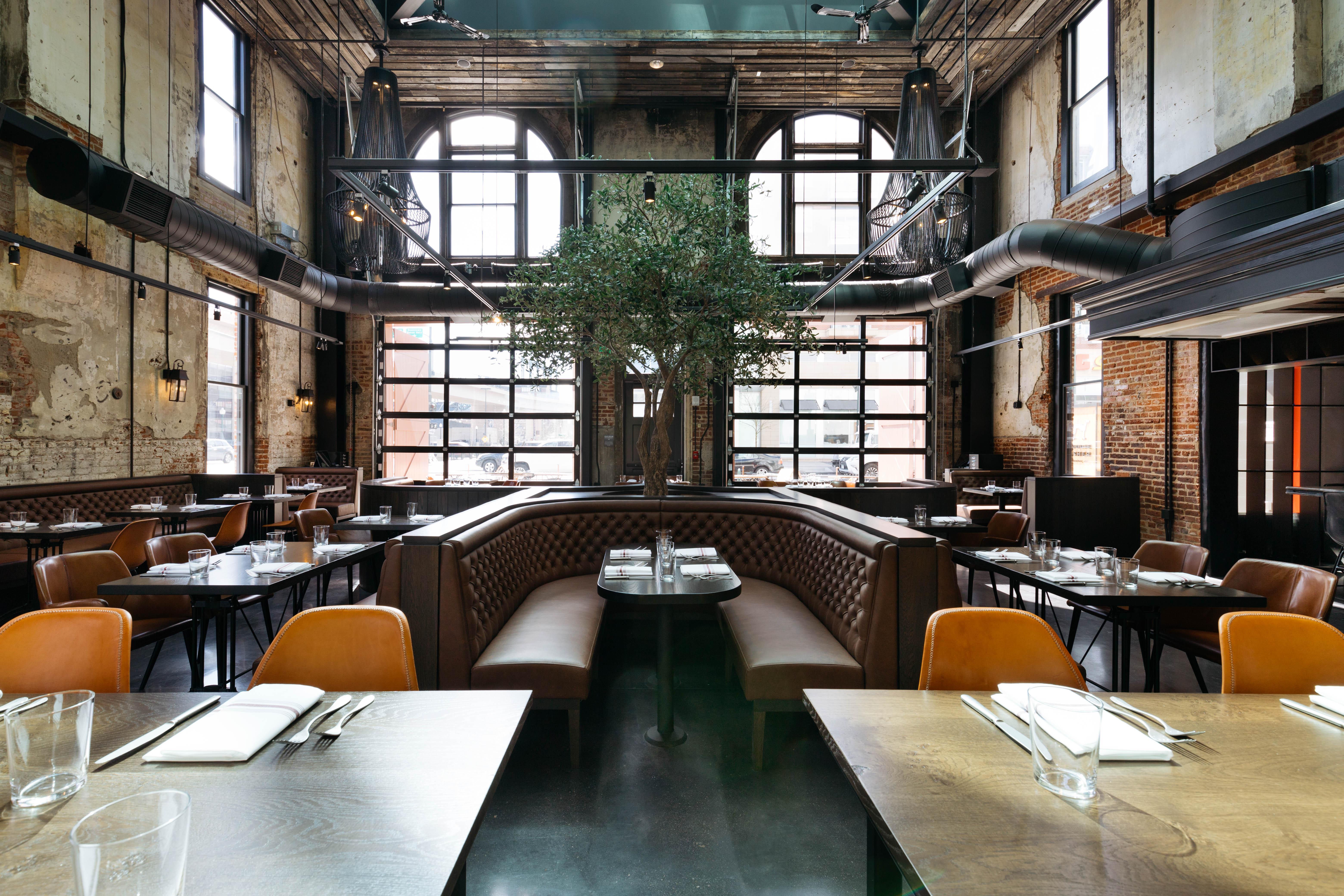 This space features original brick walls built in the late 1800's lovingly restored. A glass ceiling, bicycle chain chandeliers, an original tree from the 1800's as the centerpiece, glass garage doors, and outdoor patio space opportunities.