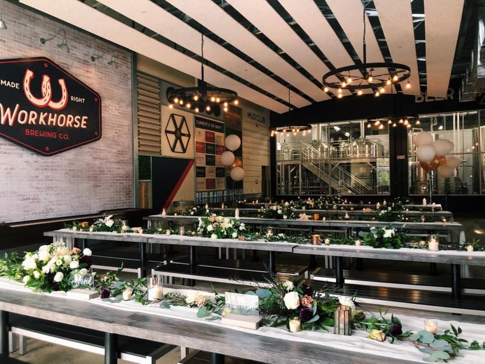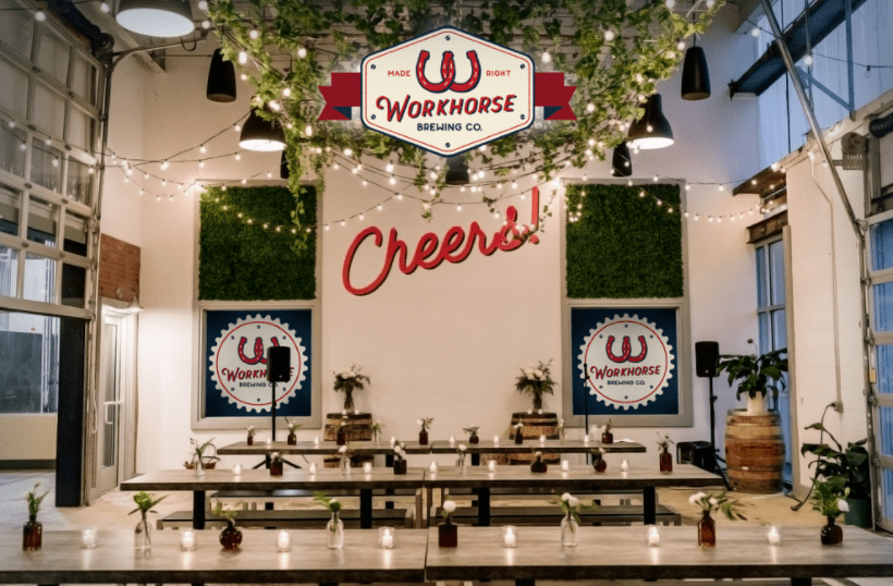 Say "I Brew" in our 1,200-square-foot private event space, featuring roll-up garage doors, bistro lights, and contemporary decor—a perfect setting for an intimate yet stylish gathering. This space accommodates up to 85 guests seated or 125 guests with private bar access, ensuring a personalized and exclusive experience. For larger events, our expansive 5,000-square-foot Taproom offers a dynamic setting with views of the brewery and production area, creating a unique backdrop for your celebration. This space comfortably accommodates up to 200 guests, making it ideal for weddings, corporate gatherings, and milestone celebrations. No matter the occasion, Workhorse Brewing Company provides the perfect blend of craft beer, ambiance, and hospitality to make your event truly unforgettable. Book your event with us today!