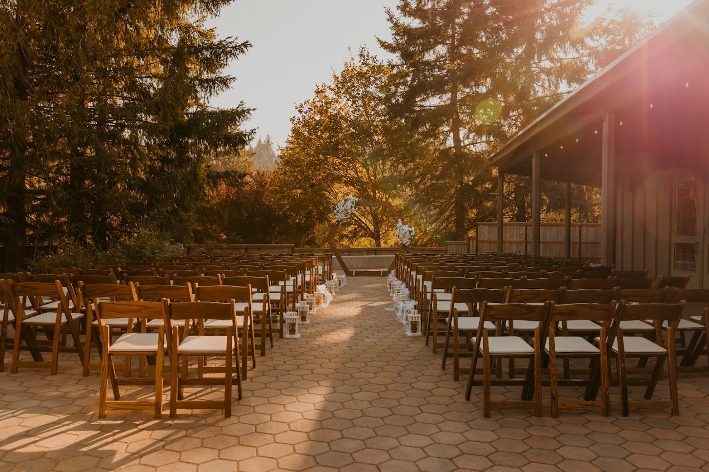 - Sound System - All furniture, except outdoor chairs - Wooden Arbor - Customizable lighting - 2 Restrooms - Bridal suite - Full kitchen - Vendor parking - ADA Accessibility