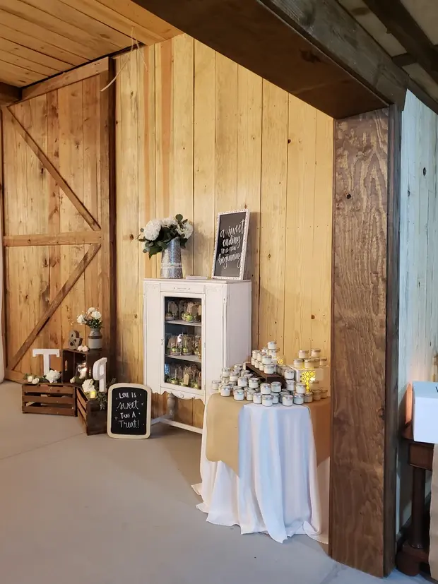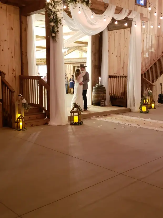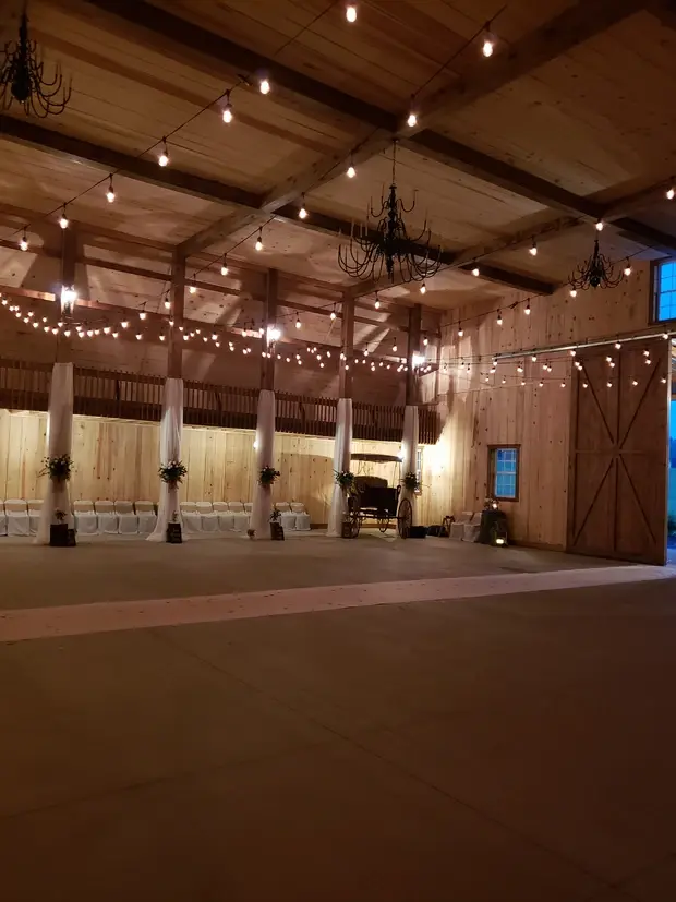 Black chandeliers cast a unique and stylish glow over the rich pine wood accents, enhanced by the inviting Edison lights. Dark stained doors add to the cozy and distinctive character of this space. Embrace a setting that blends natural beauty with contemporary flair for your special occasion.