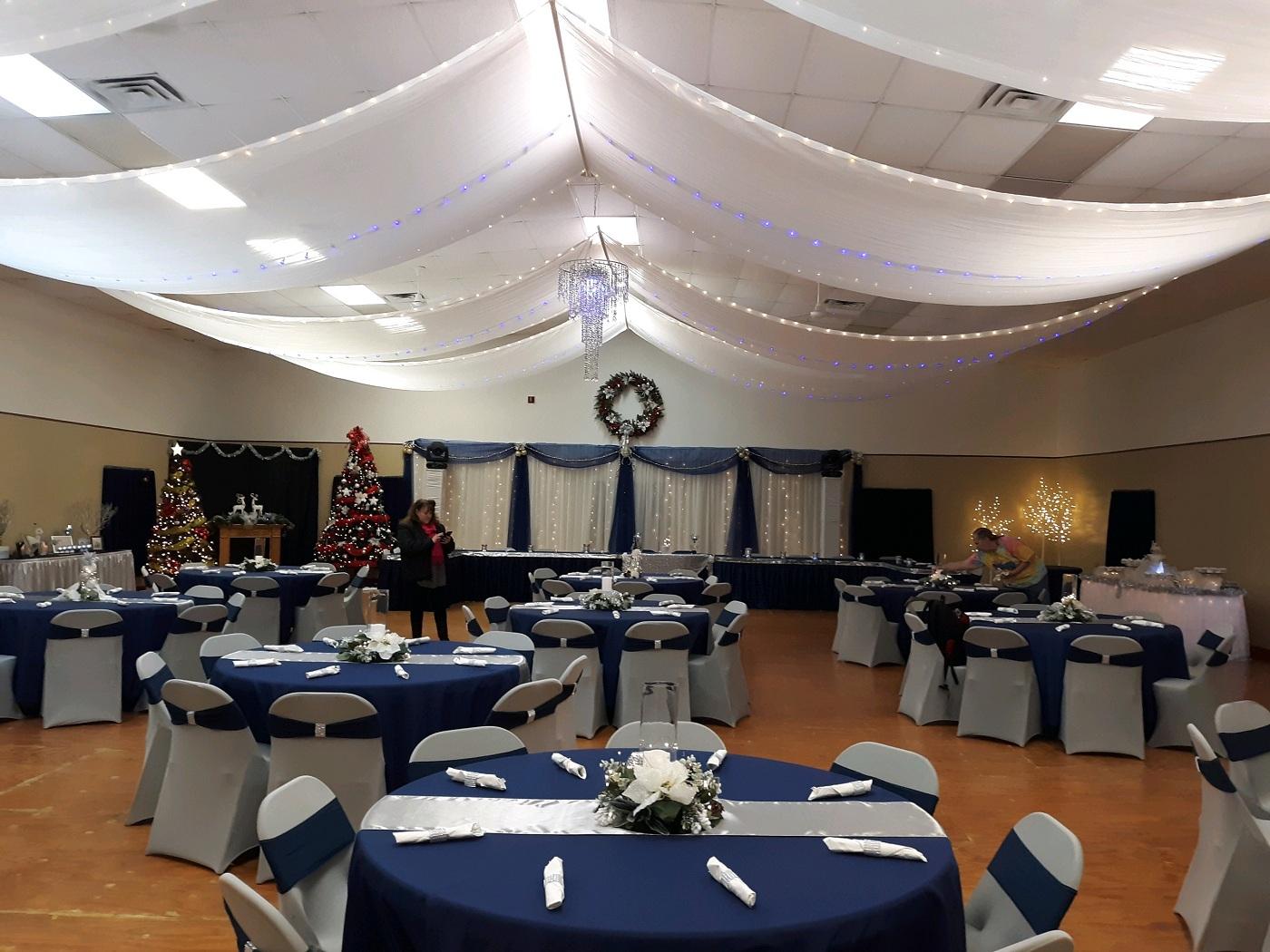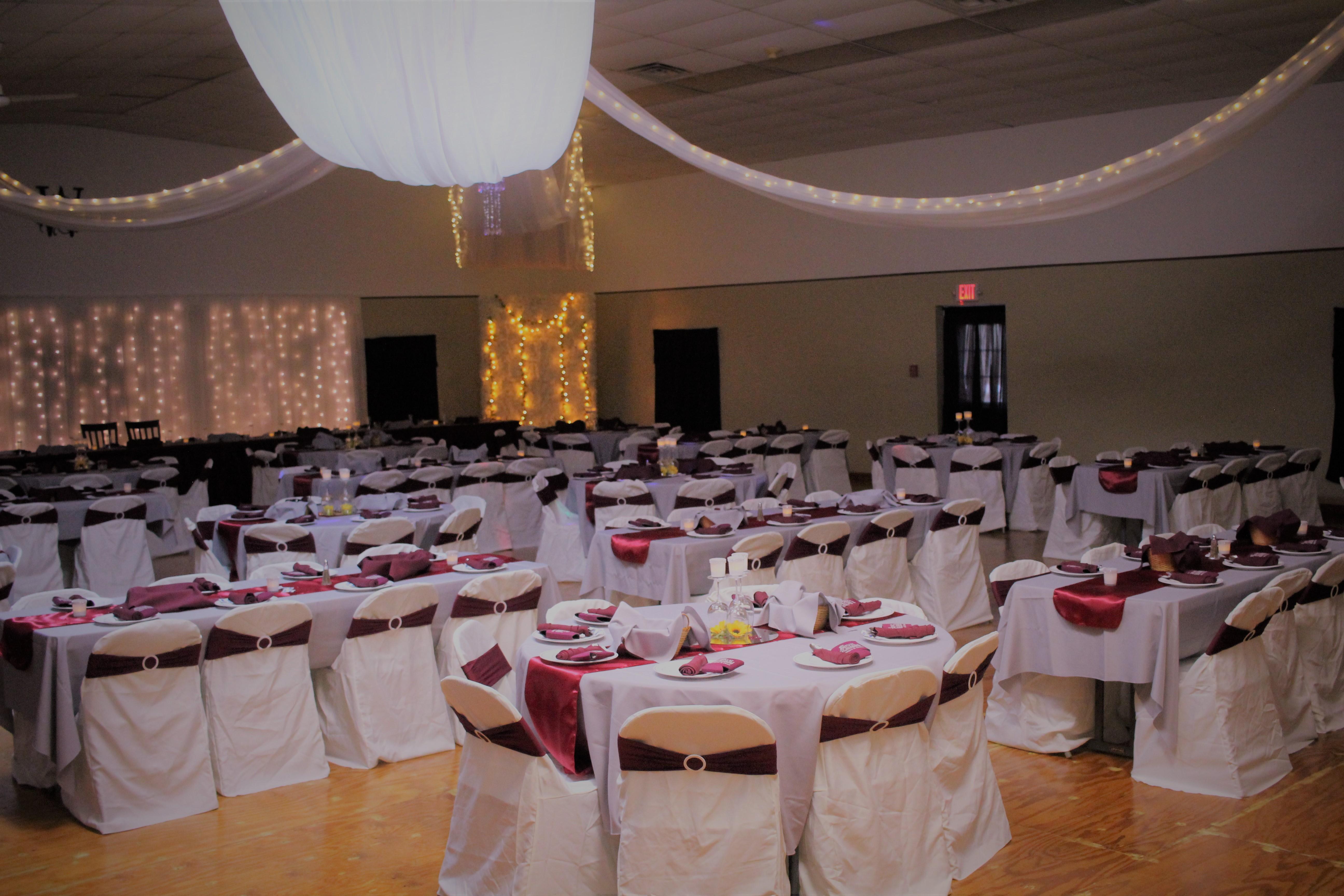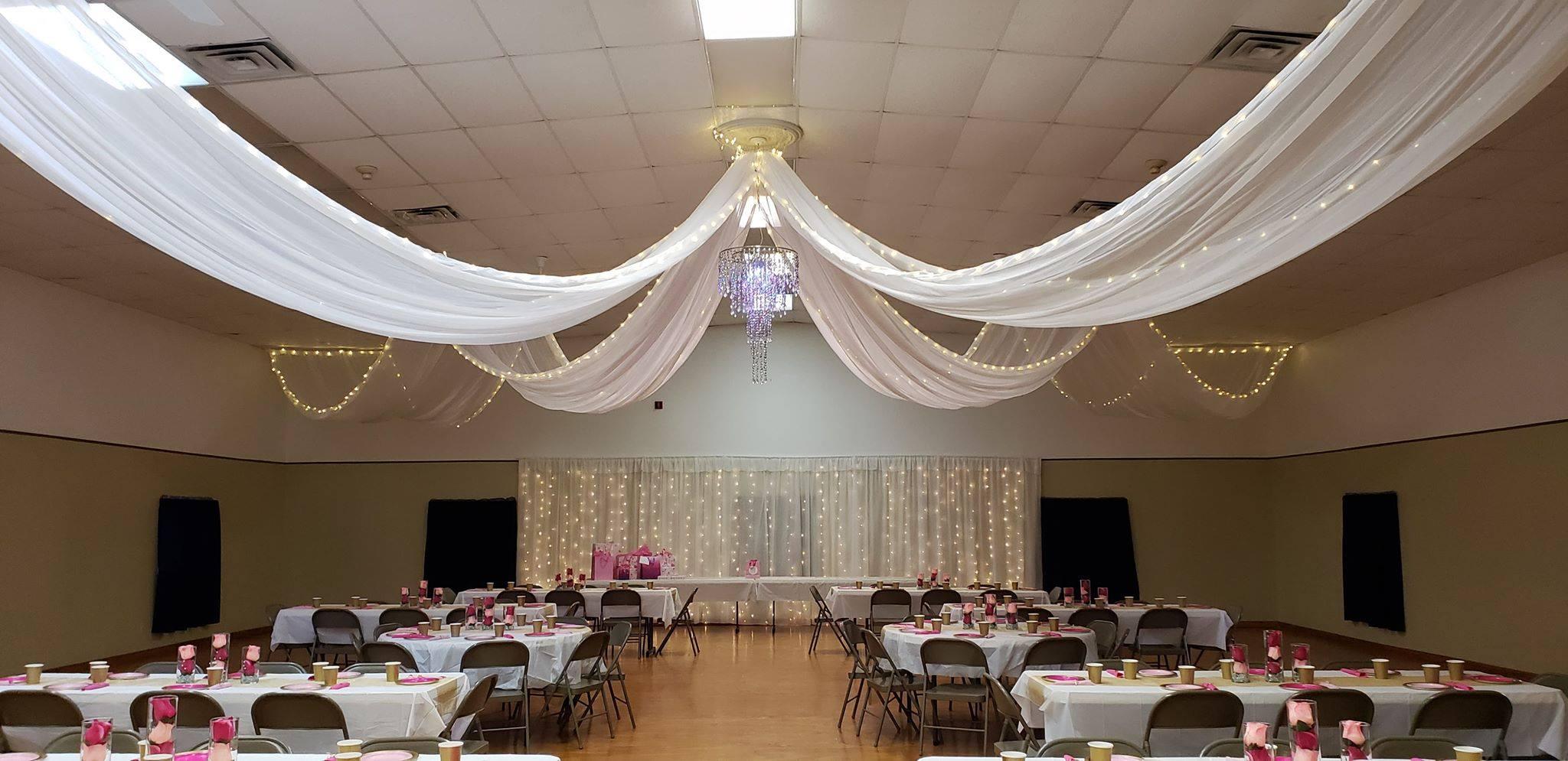 - 20' of Lighted Wall Drapes - Lighted Ceiling Drapes & Sparkling Chandelier - Tables & Seating for up to 125 People - 8' Banquet & 5' Round Tables available - Onsite Parking - Handicap Accessible & Baby Friendly - Large Kitchen for Serving & Preparation - Ample Electrical Outlets for Entertainment & Other Needs