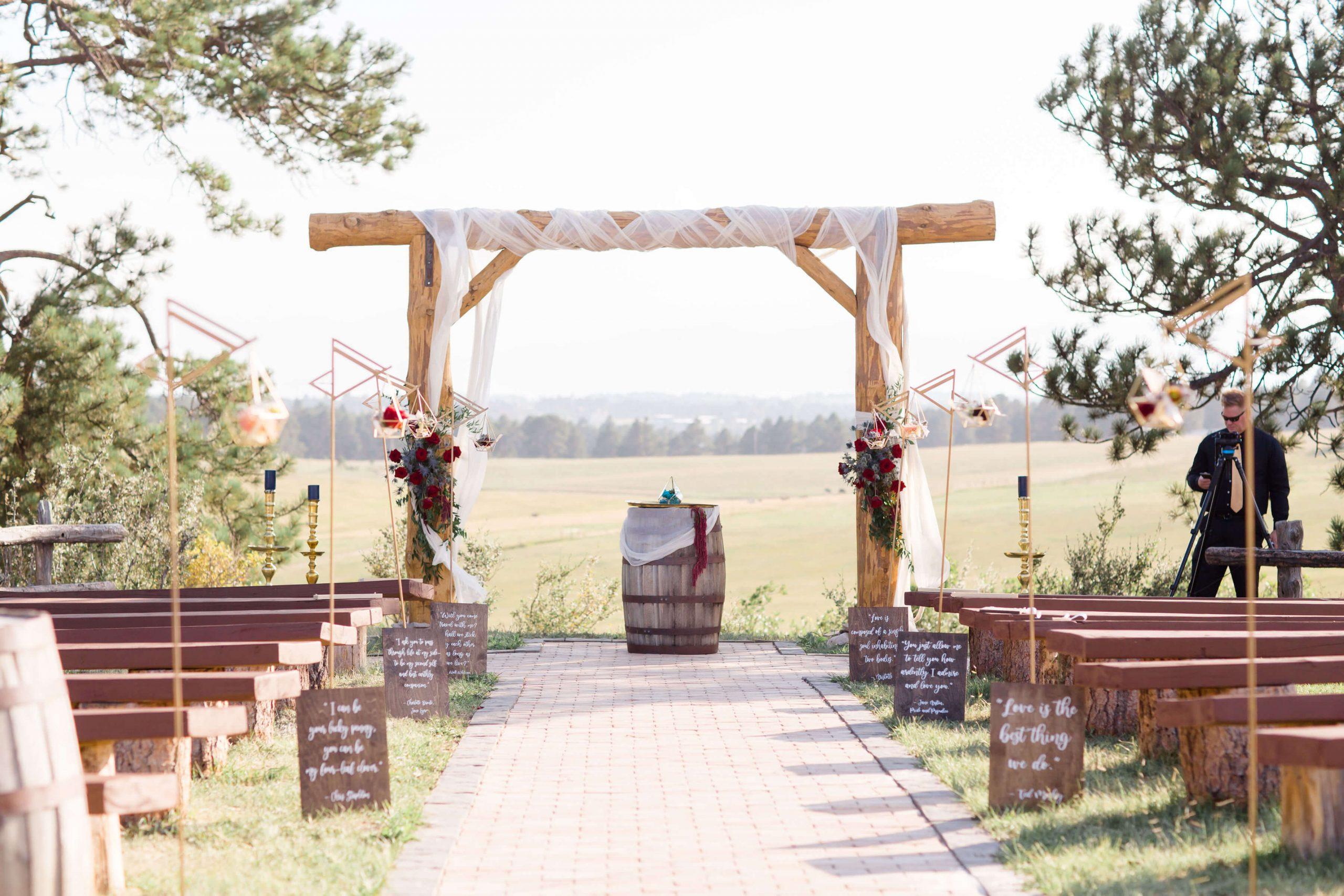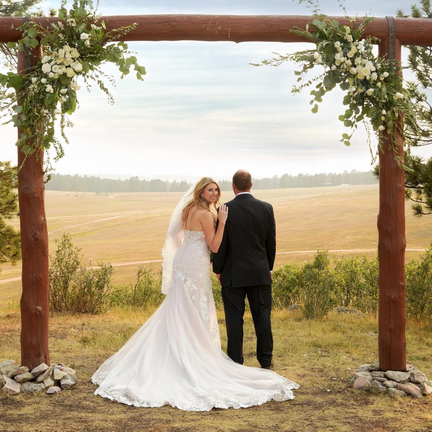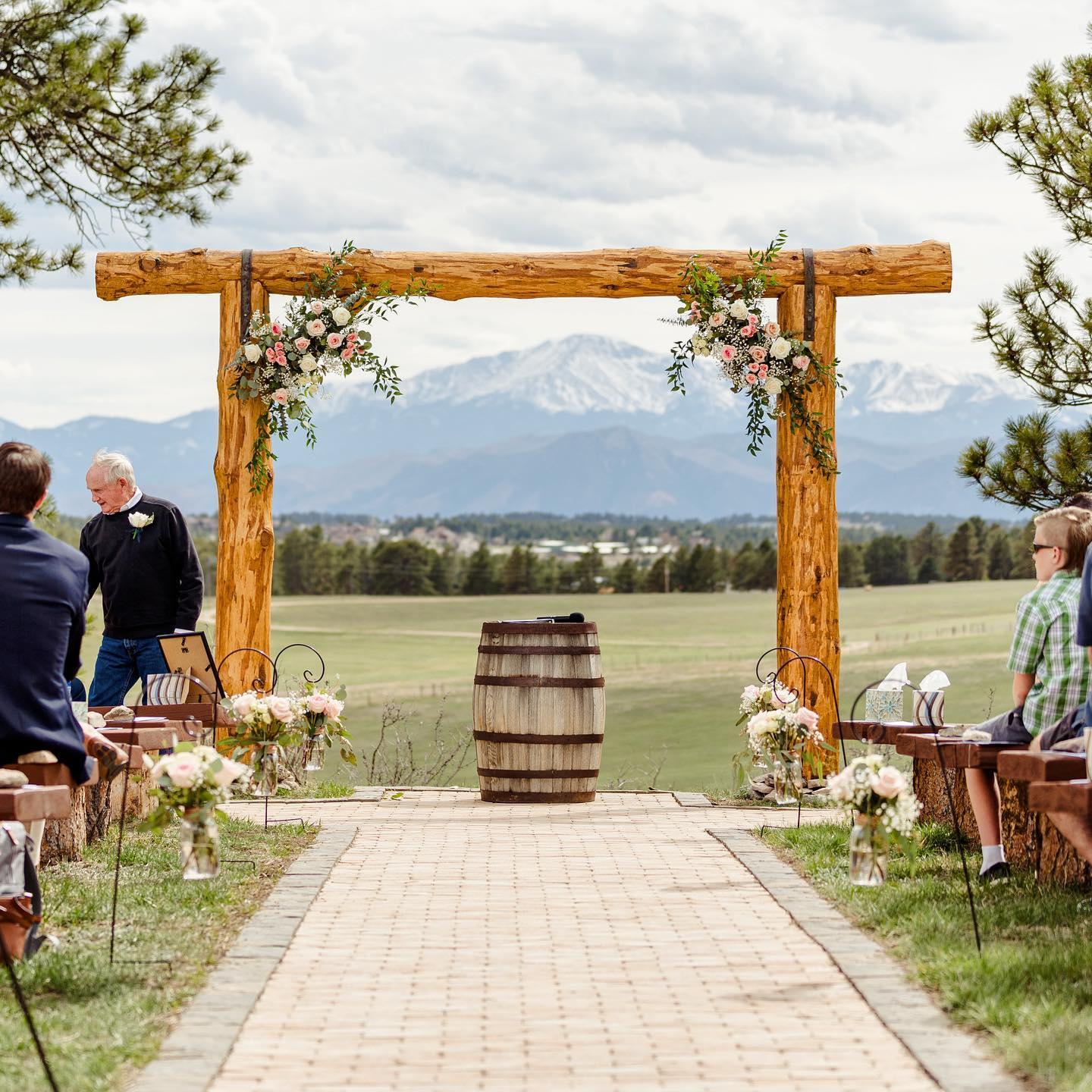Unmatched 25-mile view of Pikes Peak set amongst towering pines and soaring red-tail hawks. Hand peeled blue stained ponderosa pine arch envelopes you and your soulmate as you say, “I do!”
