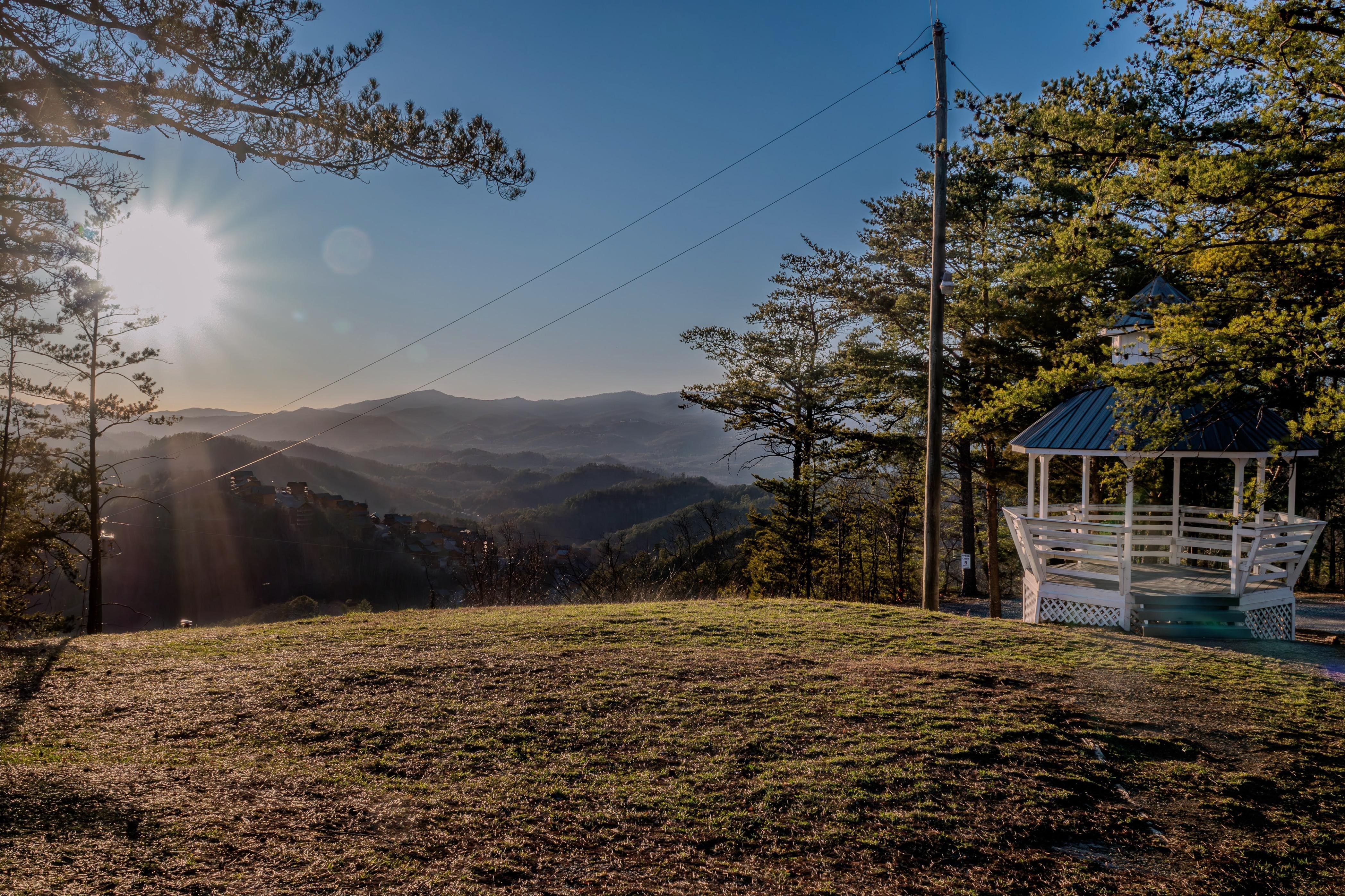 Gazebo with outlets Outside chapel with lights and outlets Open area with mountain views