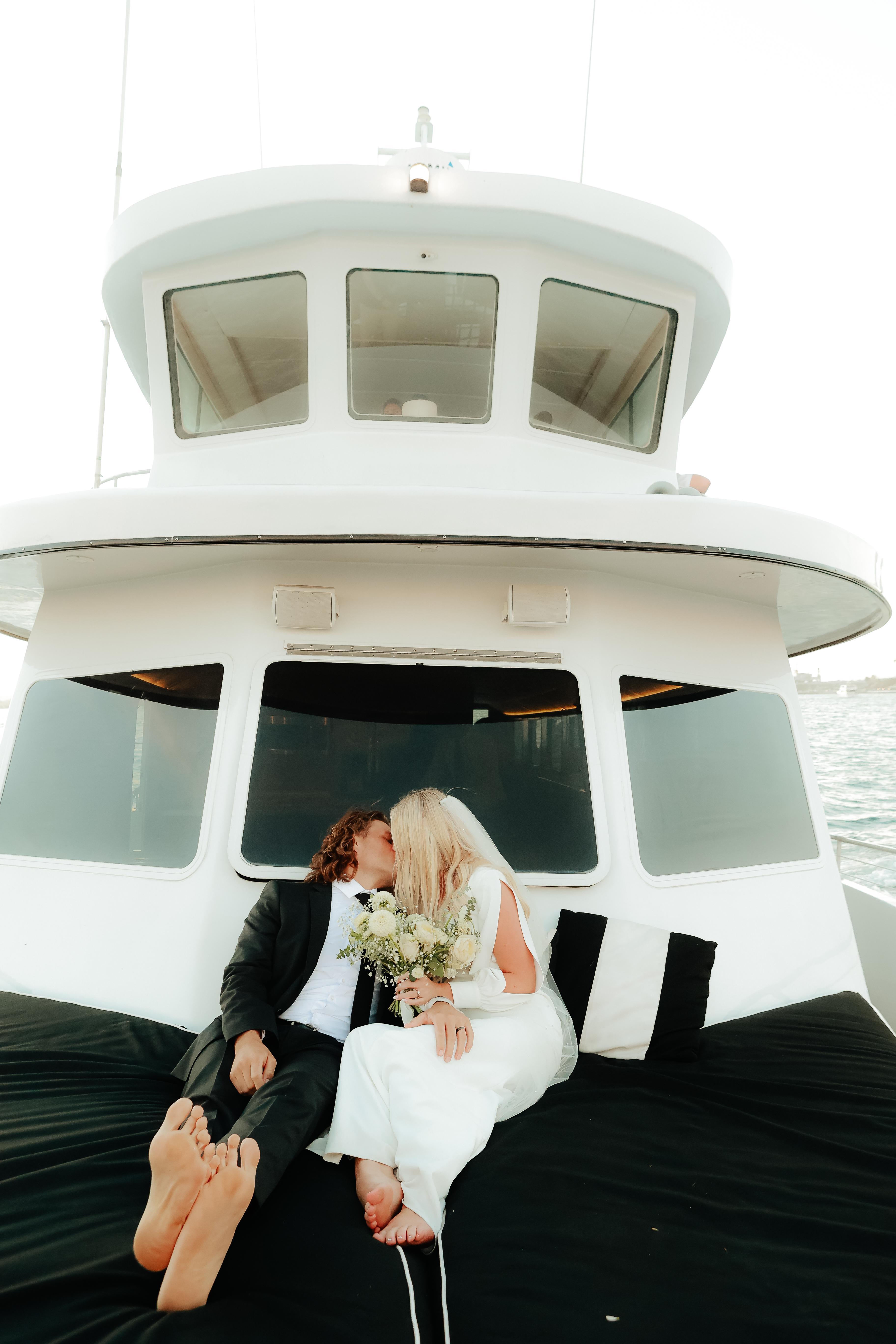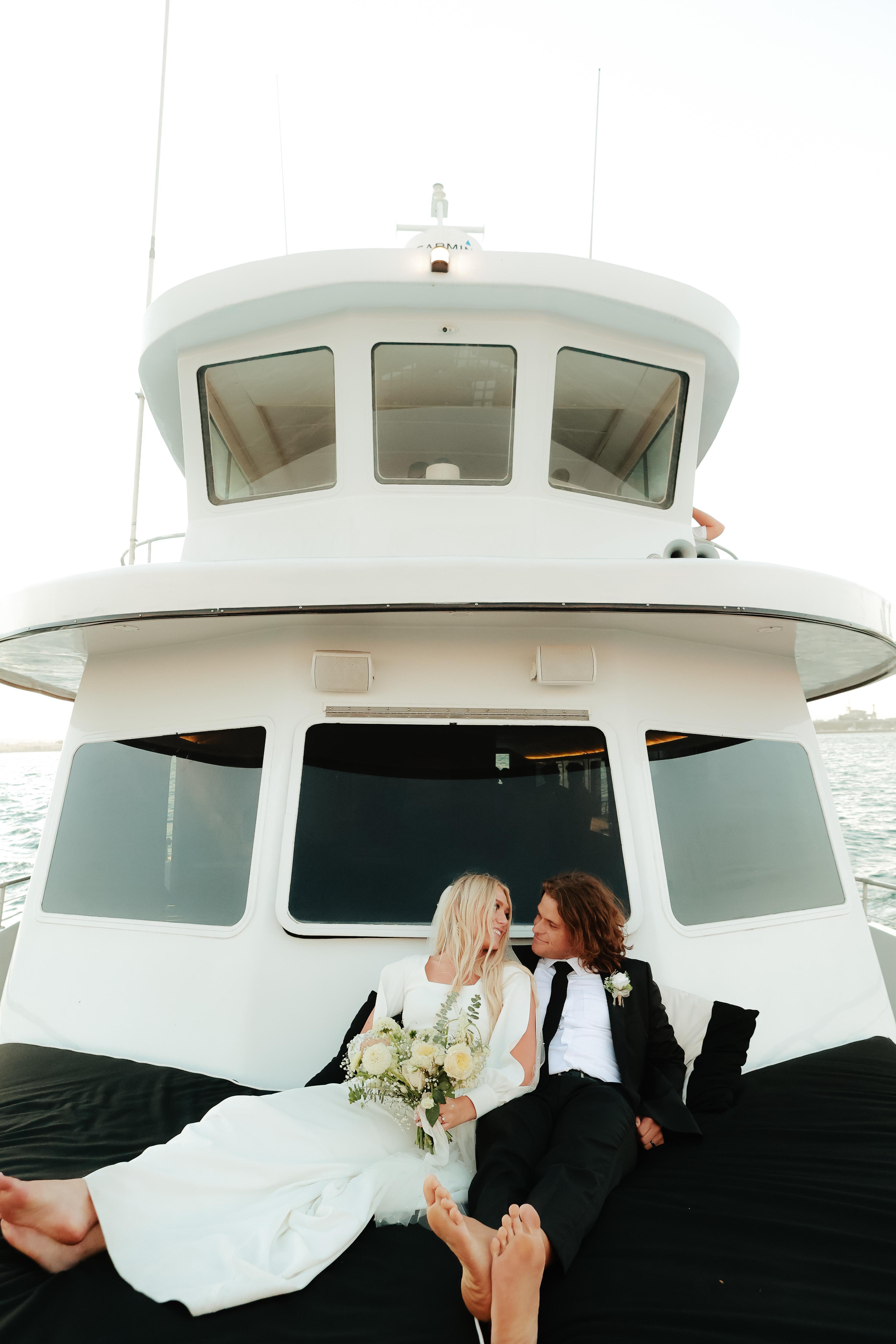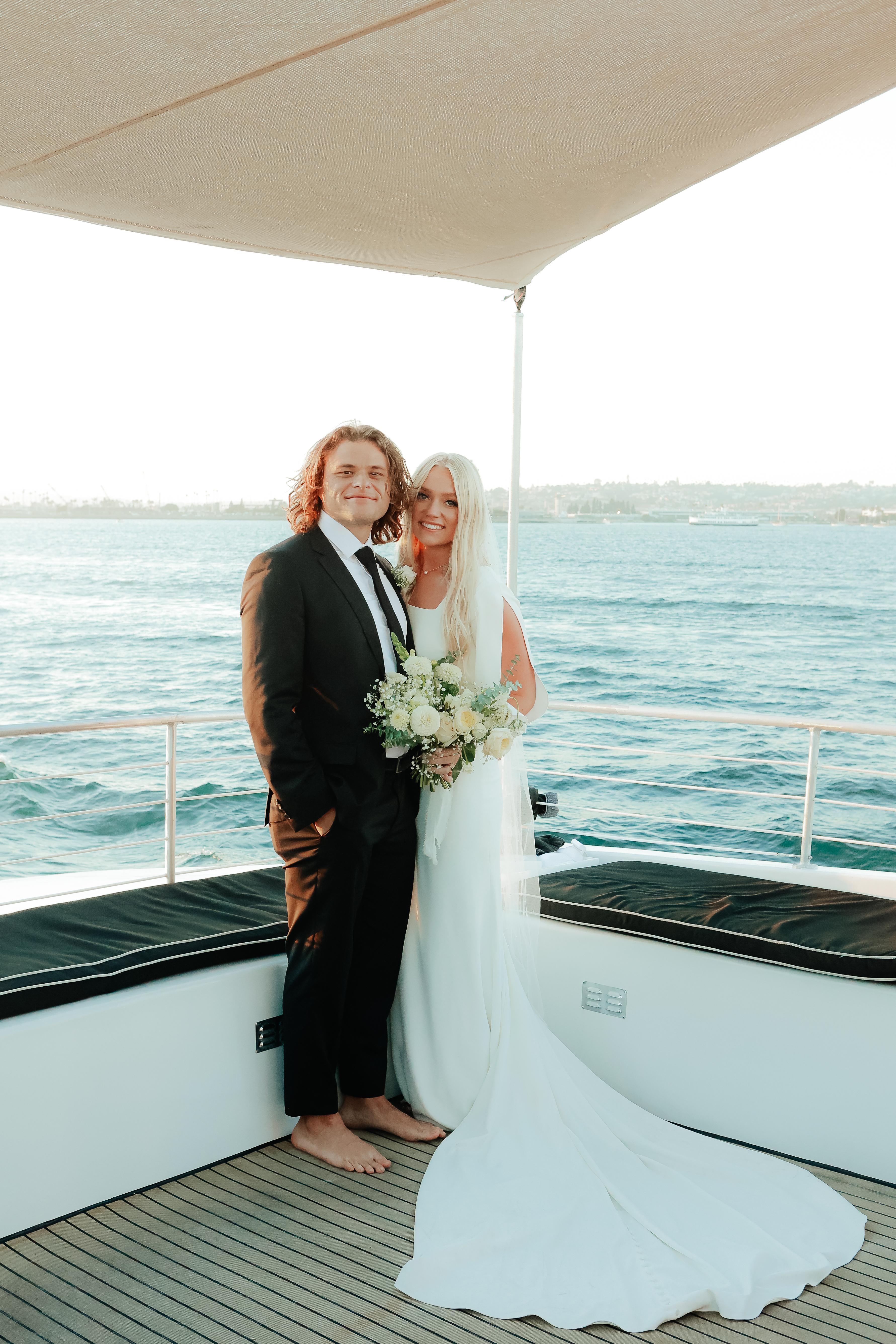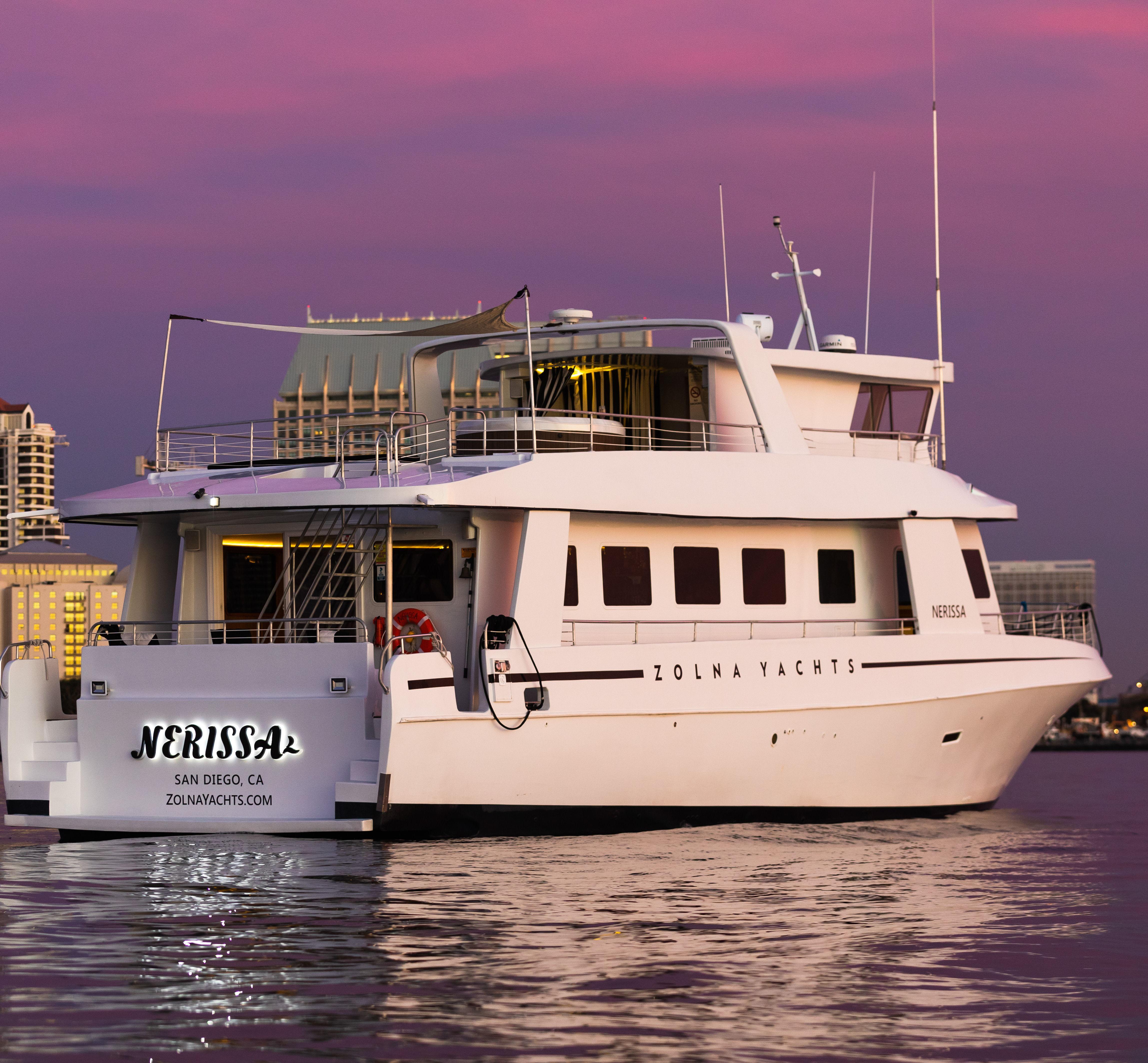 Exchange vows aboard the Nerissa motor yacht, the ultimate waterfront wedding venue on San Diego Bay. With a full bar, spacious dance areas, and panoramic views, the Nerissa offers an unforgettable setting for your special day. Host your ceremony on the upper deck with world-class scenery, then celebrate with catering, live music, and entertainment tailored to your vision. Our onboard chefs craft mouthwatering menus to suit your budget, while a state-of-the-art sound system transforms any space into the perfect dance floor. Please note, the yacht accommodates a maximum of 49 passengers, including service personnel such as caterers and photographers. For larger guest lists, consider hosting a rehearsal dinner or wedding photo cruise instead. The top deck, now redesigned after the removal of our hot tub, provides an unparalleled space for live bands, dancing, and soaking in the stunning bay views. Reach out today to let our expert team bring your dream wedding to life!