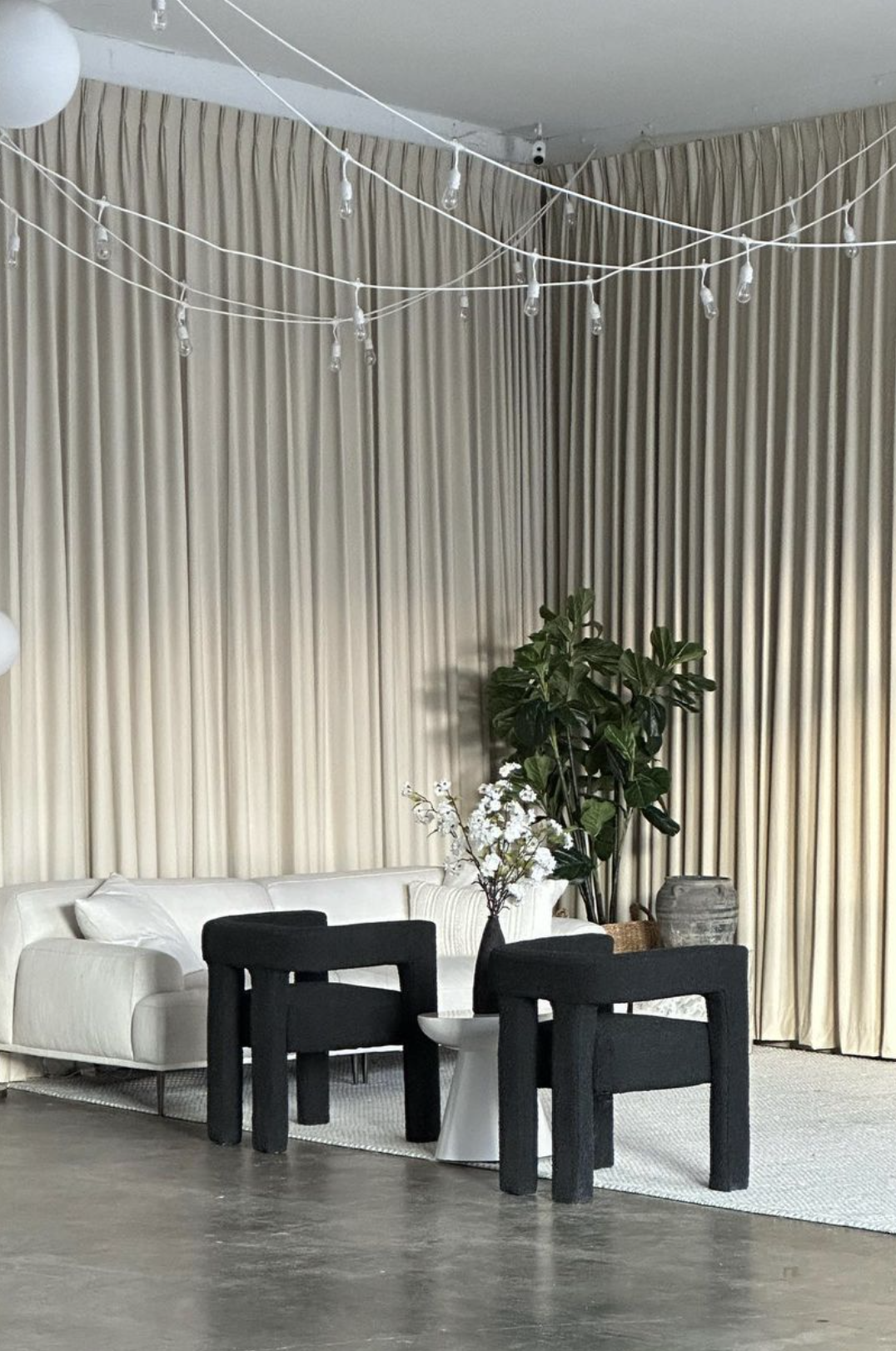 Industrial White brick walls, Concrete floors for even photo tones, Adorned with Two large south facing windows for loads of natural light. The back wall has the beautiful statement curtain wall. The space has Air conditioning & heating Backdrop wall mount with three neutral colors: white, bone, mocha as well as the Rolling wall on wheels with two colors: black & white. The space also has a assortment of furniture, and chairs and tables to rent if needed. Sink, mini fridge and on site restroom